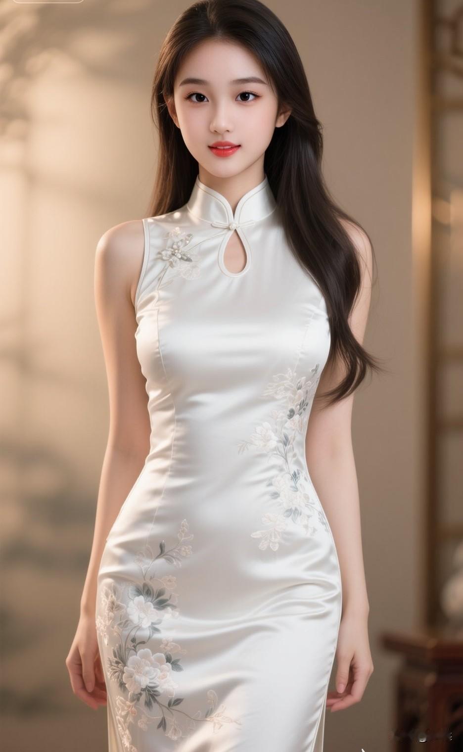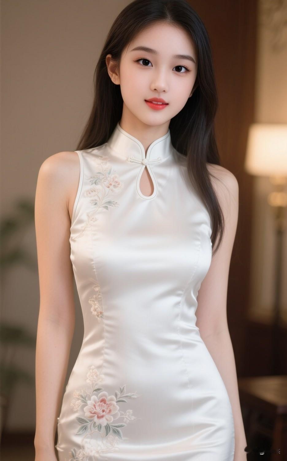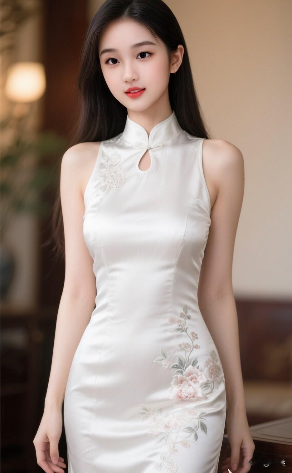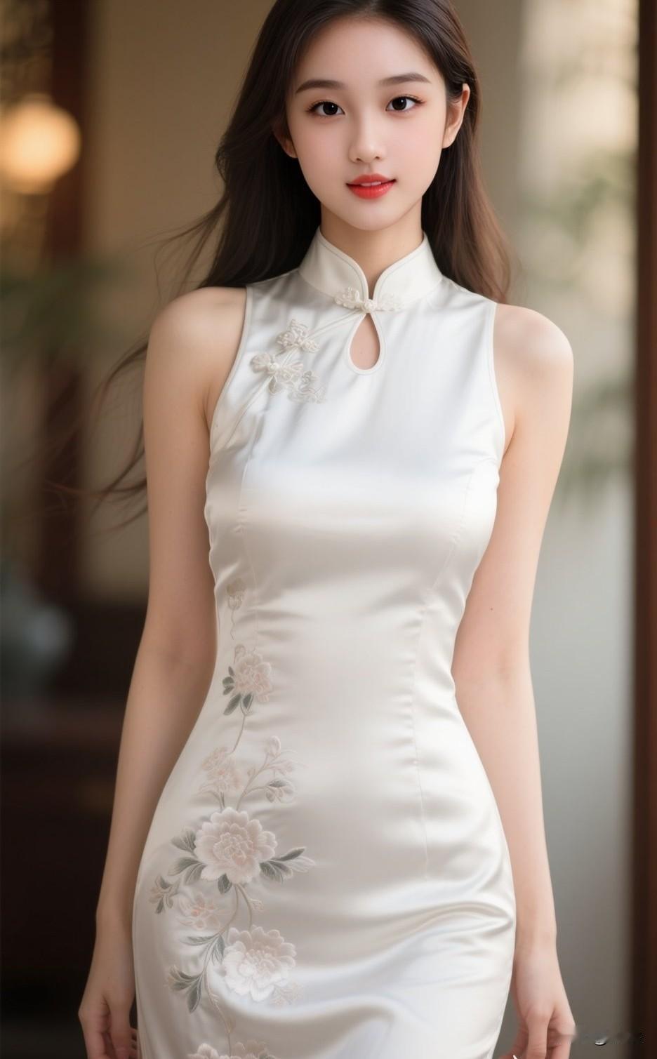 端庄典雅的旗袍如何穿出时尚?′白色缎面旗袍自带清冷贵气,无袖剪裁勾勒肩颈线条,领口镂空与缠枝牡丹刺绣相映,古典韵味里揉进了现代精致。顺直长发弱化繁复感,红唇提气又不抢镜,将传统旗袍的端庄拆解重组,用简约搭配让东方美适配现代审美,典雅与时尚便这样浑然天成。