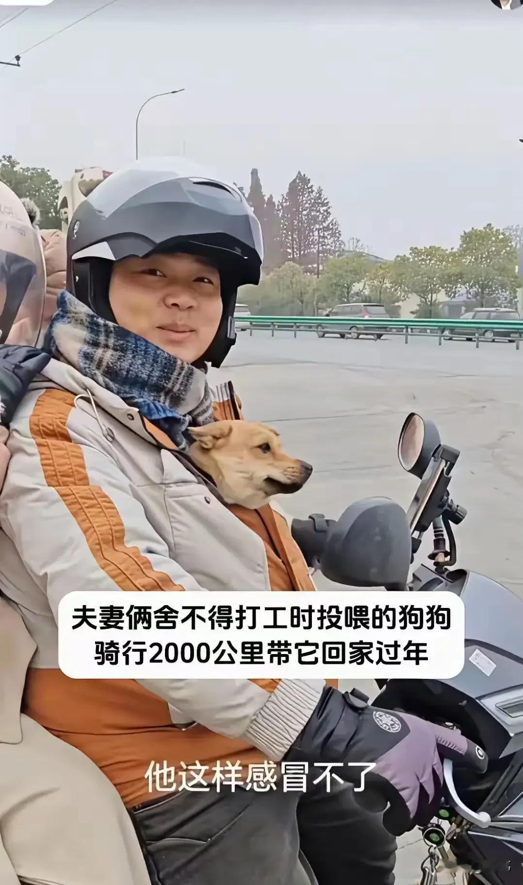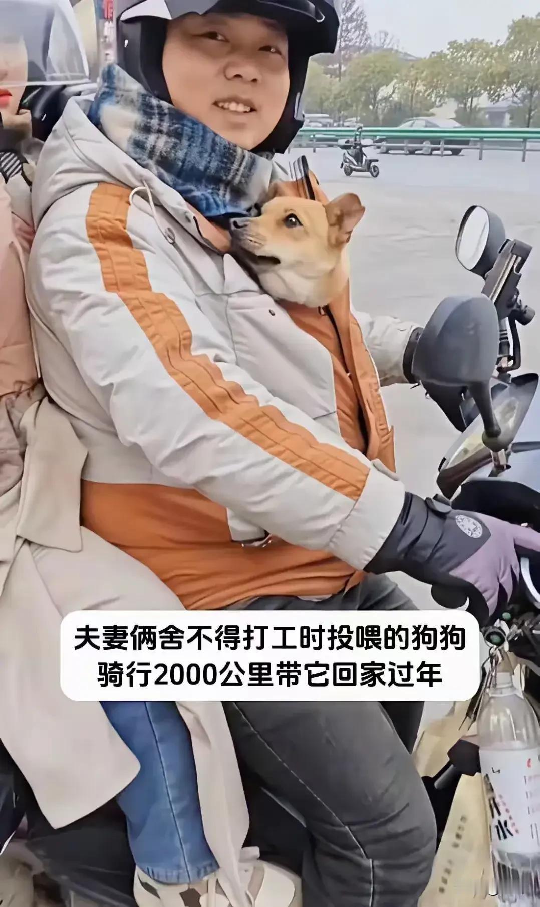 泪目了!这天一位小姐姐去散步,结果走到一条马路上的时候,看到非常感人的一幕,一对夫妻骑着摩托车在等红绿灯,而男主人得怀里居然有一只狗狗,它被很好的包裹在了衣服里,只露出一个头来,这样它就不会冷了,可见他们是多么宠爱这只狗狗。 小姐姐于是就上前询问他们,结果一听他们的解释更为感动,原来这只狗狗是他们收养的,他们是外地人,最近因为春节快到了,要返乡过年,而且明年估计不来这里了,而又舍不得这只狗狗,于是决定骑行2000公里把它带回去养。 小姐姐非常佩服他们的毅力,不停地给他们加油打气,希望他们一路平安,越来越好!