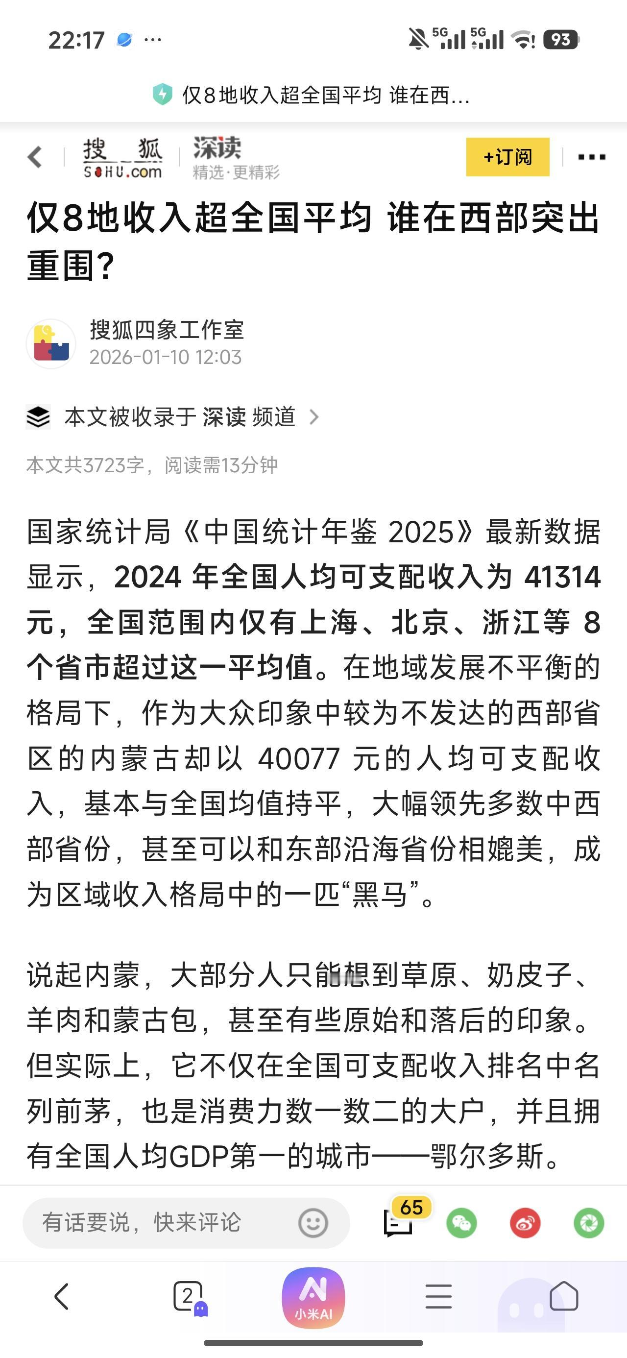 感觉意外吗?全国只有8省市人均可支配收入超过全国平均! 除了北京、上海之外,浙江的数据很能说明问题!浙江富裕程度最高真不是吹出来的! 8个发达省份拖动了全国这艘大船行稳致远。 江西的数据和GDP一样,又稳稳地占住了15位,比下优势不大,比上差距甚远,还要继续努力! 这个数据现在落后的甘肃、贵州,他们5H都有优势行业,未来前景都不会太差!