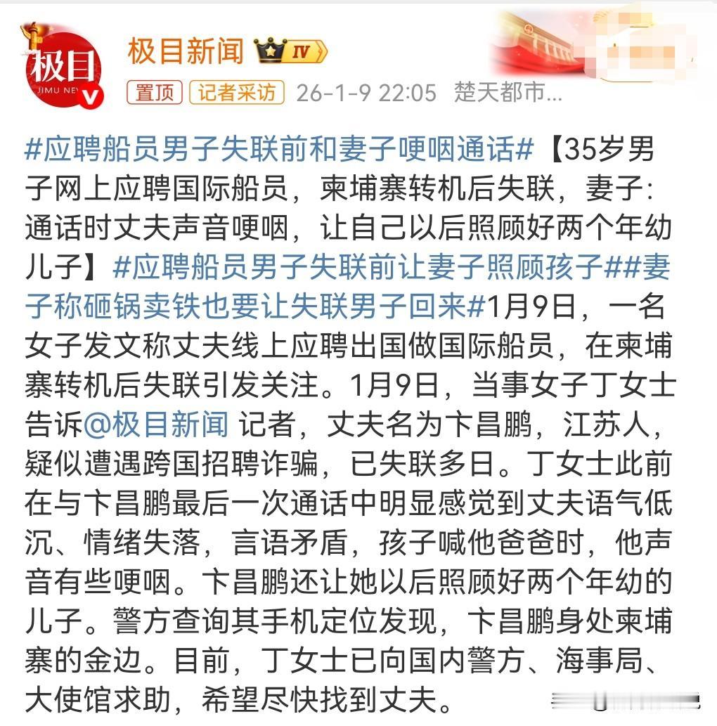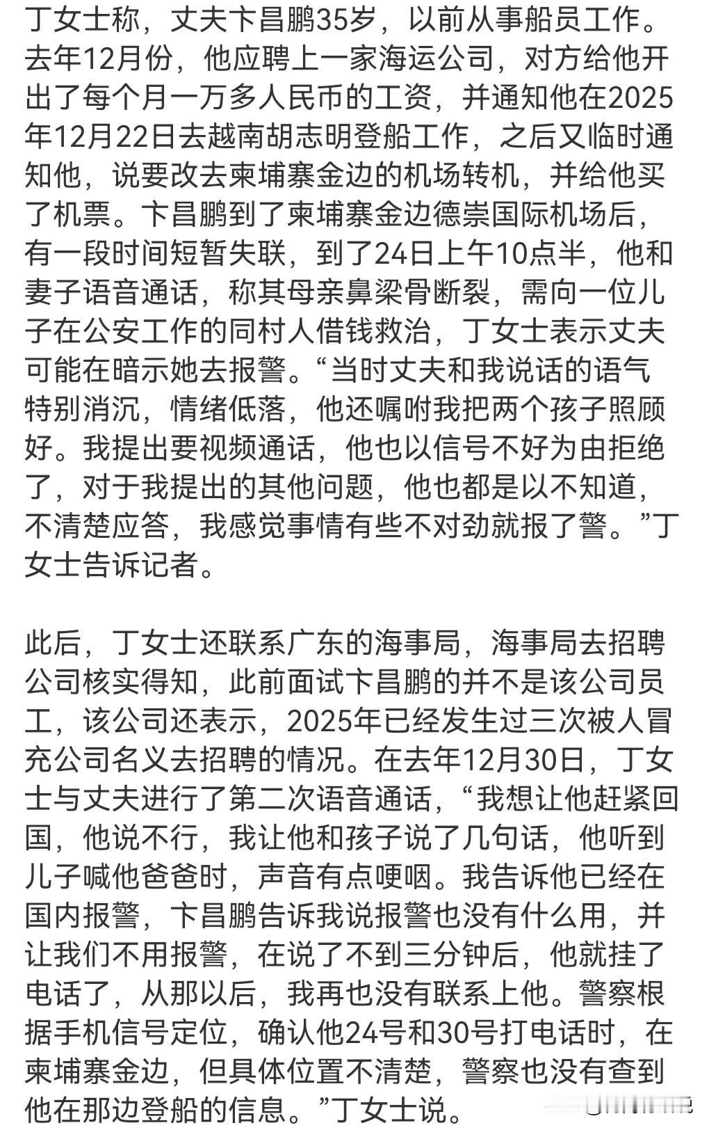这真是生命难以承受之重。丧失自由被控制起来。这种痛苦真的是让人难以消化。 1月9日(报道时间),应聘船员男子失联前和妻子哽咽通话。 当时男子有可能被控制起来了,在听到孩子喊他爸爸后他,突然哽咽起来了。 并要妻子好好的照顾好孩子。 有太多的人被控制起来了,这样被迫从事诈骗,诈骗集团实在是太可怕了,全球应该要合作起来,继续加大力度打击。 求求你们给点力吧,柬埔寨军方、缅甸军方。