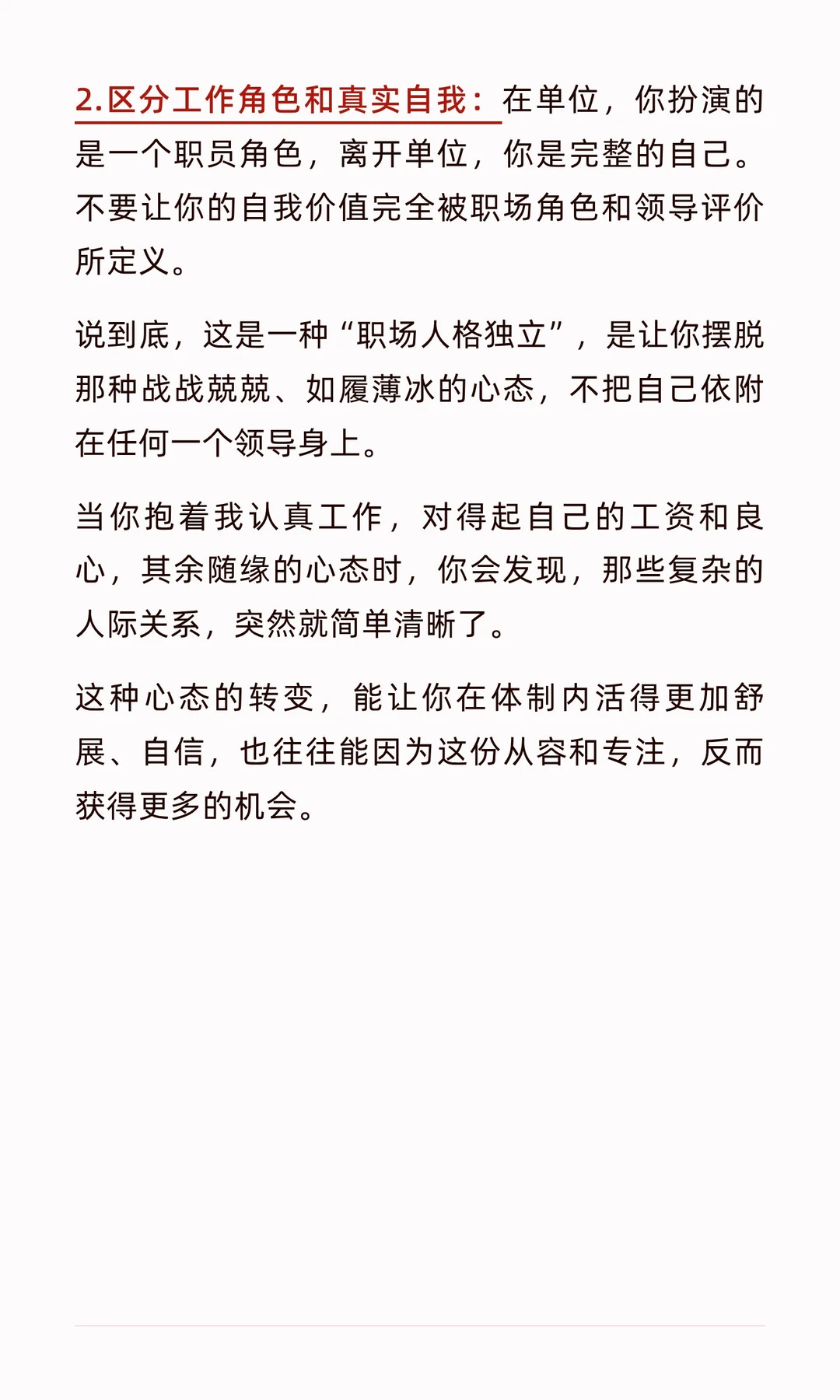 在体制内与人相处,尤其是和领导打交道,核心其实就八个字:事要做好,腰要挺直。该打招呼时热情礼貌,该汇报时清晰到位,心里千万别犯怵,别太把领导当回事。说到底,大家只是岗位分工不同,本质上都是并肩做事的同志。