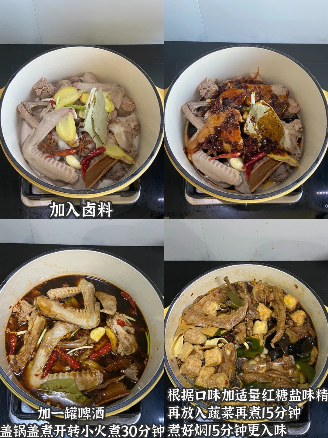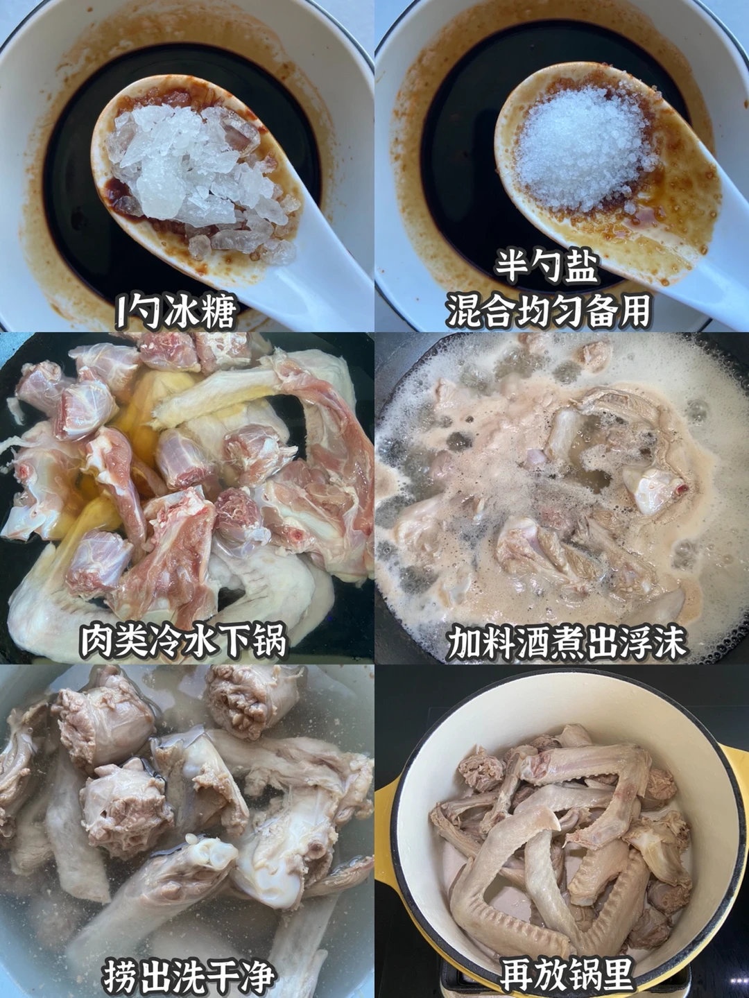 2️⃣肉类冷水下锅 加料酒煮出浮沫 捞出洗干净再放锅里 加入卤料 一罐啤酒 盖锅盖煮开转小火煮30分钟(根据口味加适量红糖盐味精)
