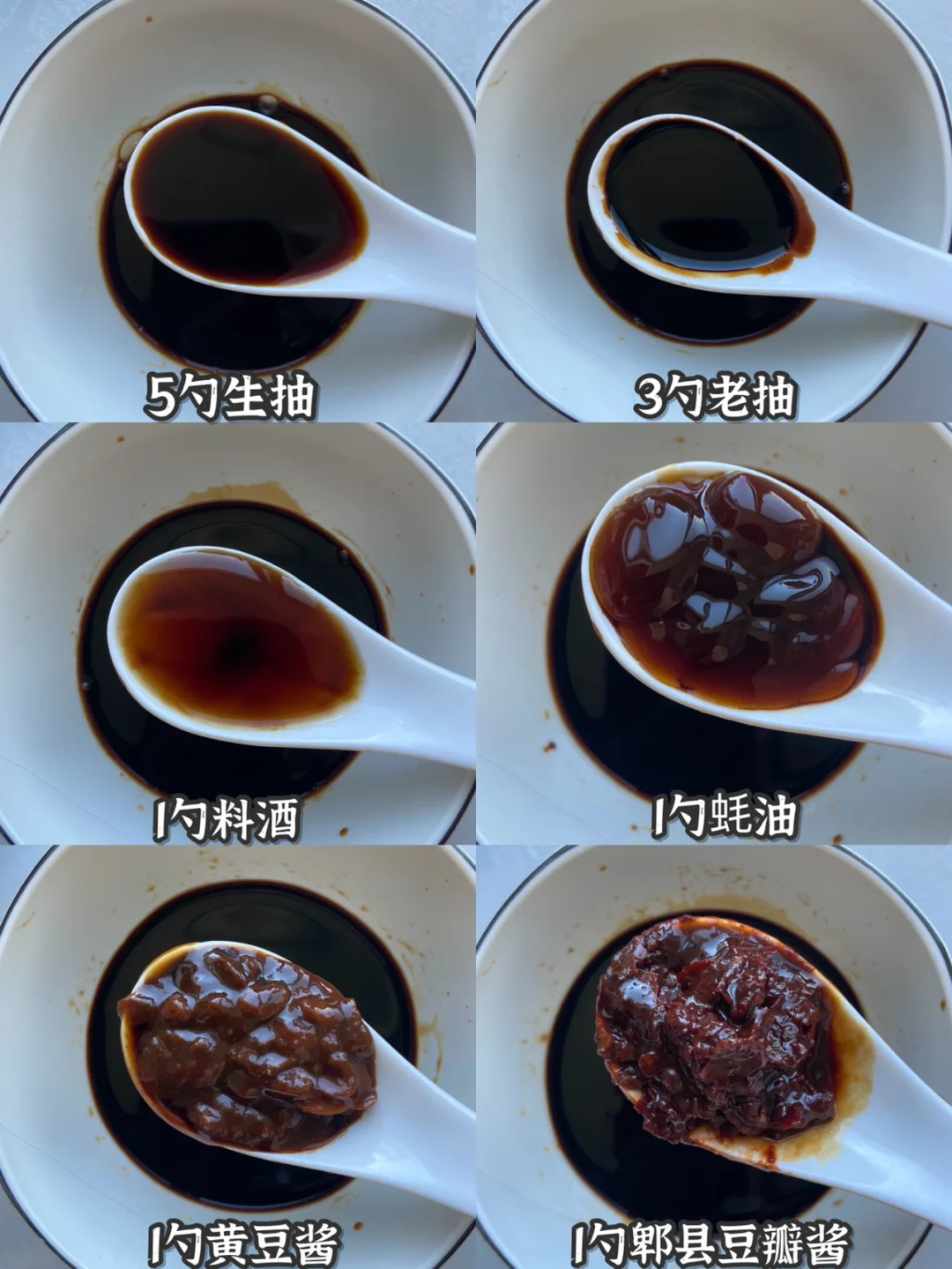 5勺生抽➕3勺老抽➕1勺料酒➕1勺蚝油➕1勺黄豆酱➕1勺郫县豆瓣酱➕1勺冰糖➕半勺盐混合均匀备用