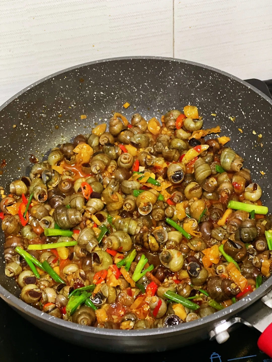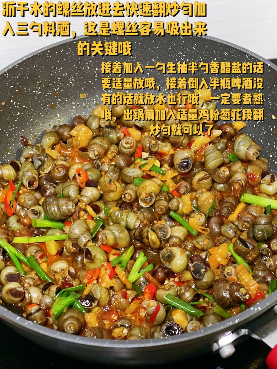 5. 沥干水的螺丝放进去快速翻炒匀加入三勺料酒,这是螺丝容易吸出来的关键哦