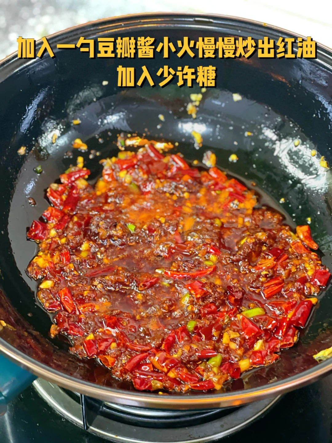 4. 加入一勺豆瓣酱小火慢慢炒出红油加入少许糖