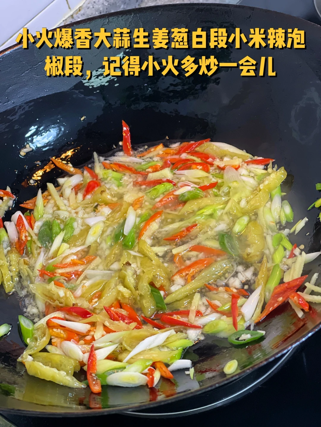 3. 小火爆香大蒜生姜葱白段小米辣泡椒段,记得小火多炒一会儿