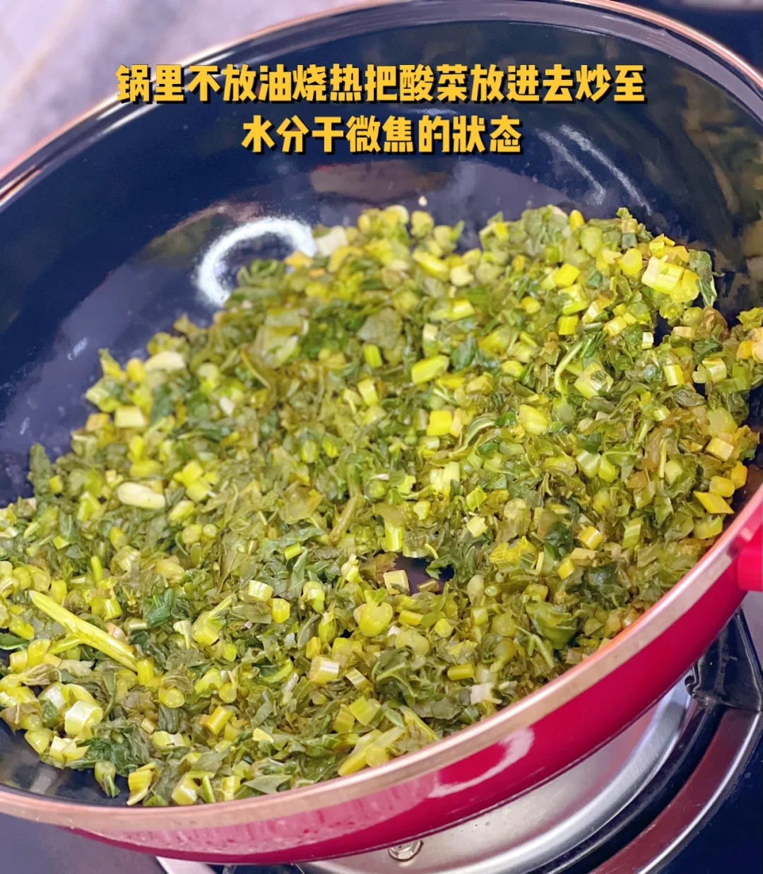 3. 锅里不放油烧热把酸菜放进去炒至水分干微焦的状态