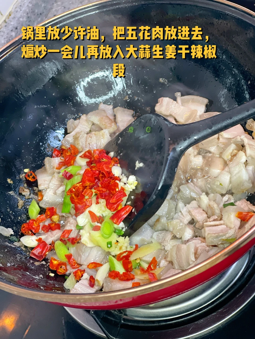 4. 锅里放少许油,把五花肉放进去,煸炒一会儿再放入大蒜生姜干辣椒段