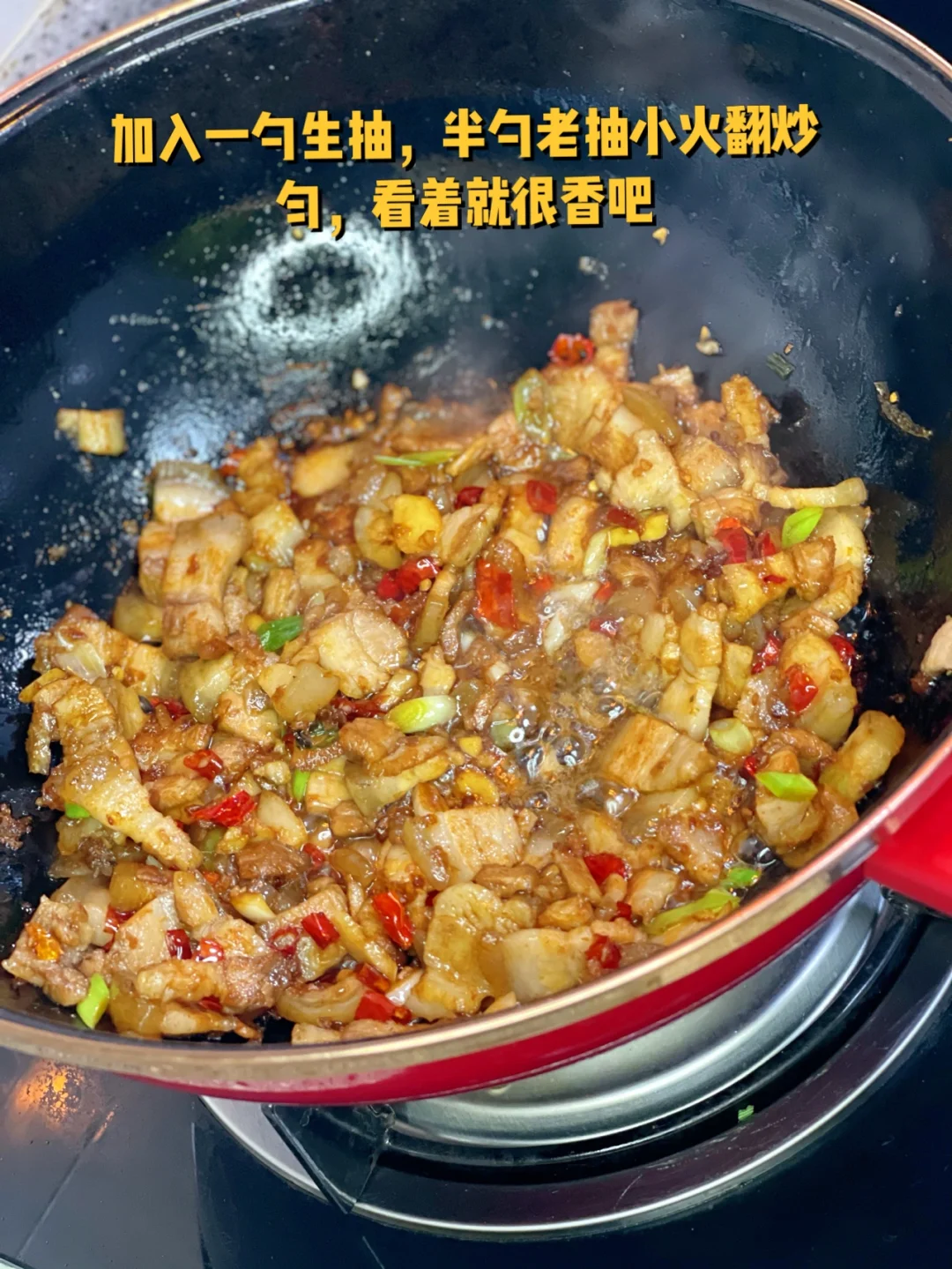 5.加入一勺生抽,半勺老抽,小火翻炒均匀看着就很香吧
