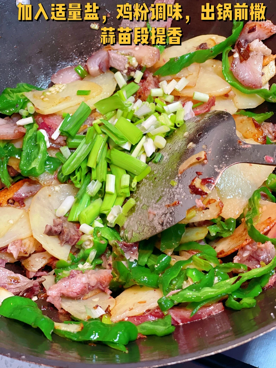 5. 加入适量盐,鸡粉调味,出锅前撒蒜苗段提香