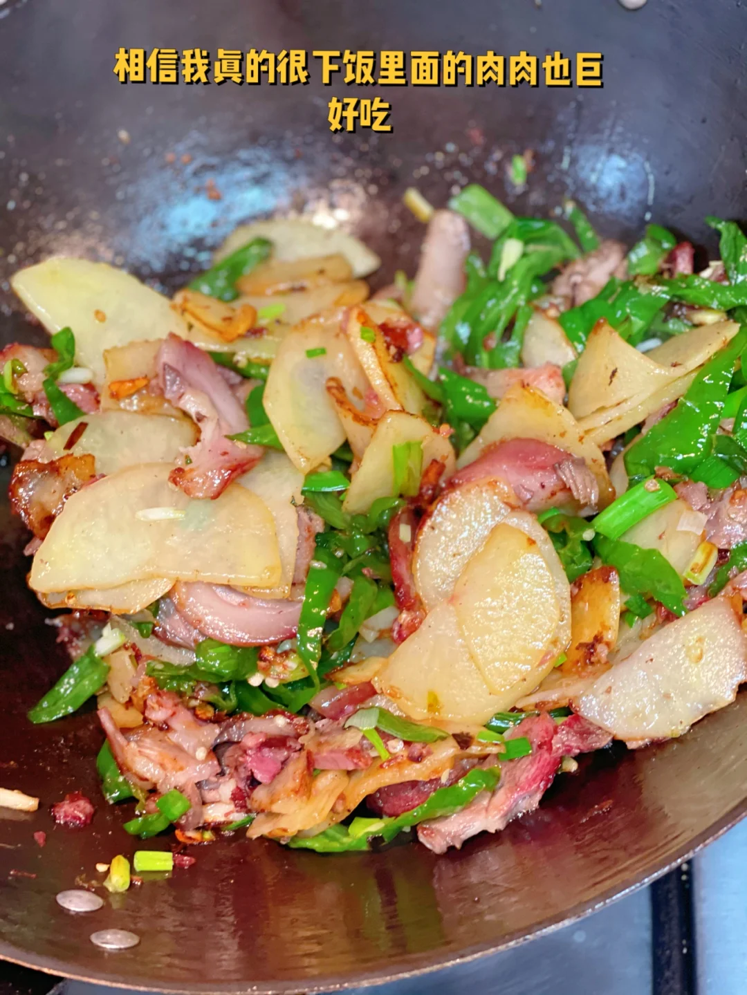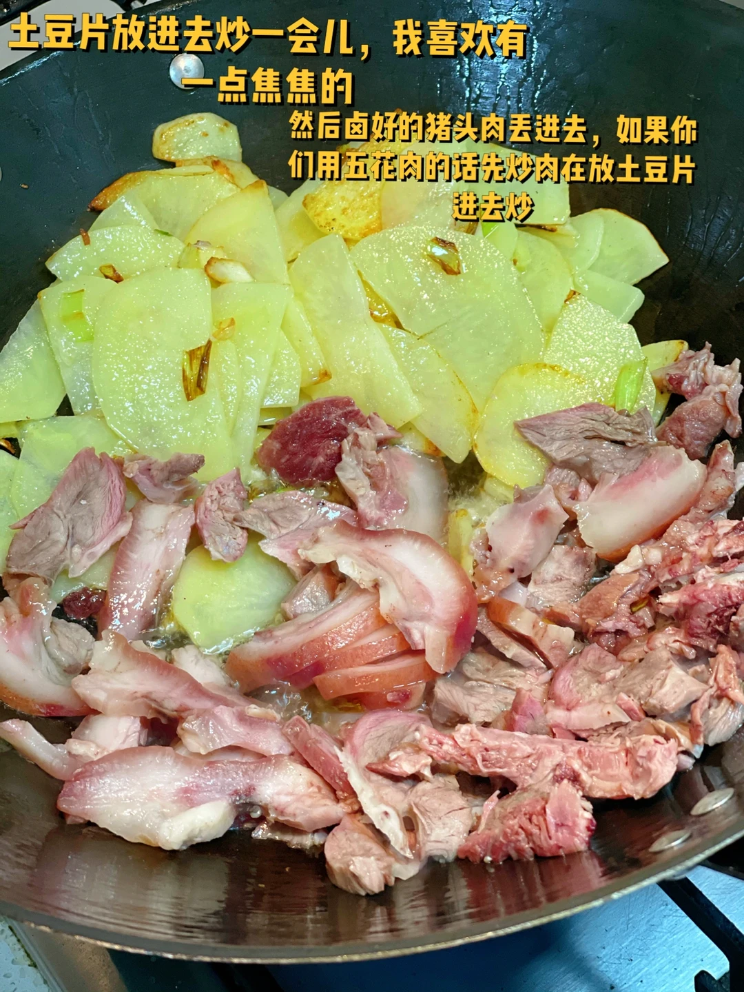 3. 然后卤好的猪头肉丢进去,如果你们用五花肉的话先炒肉在放土豆片进去炒
