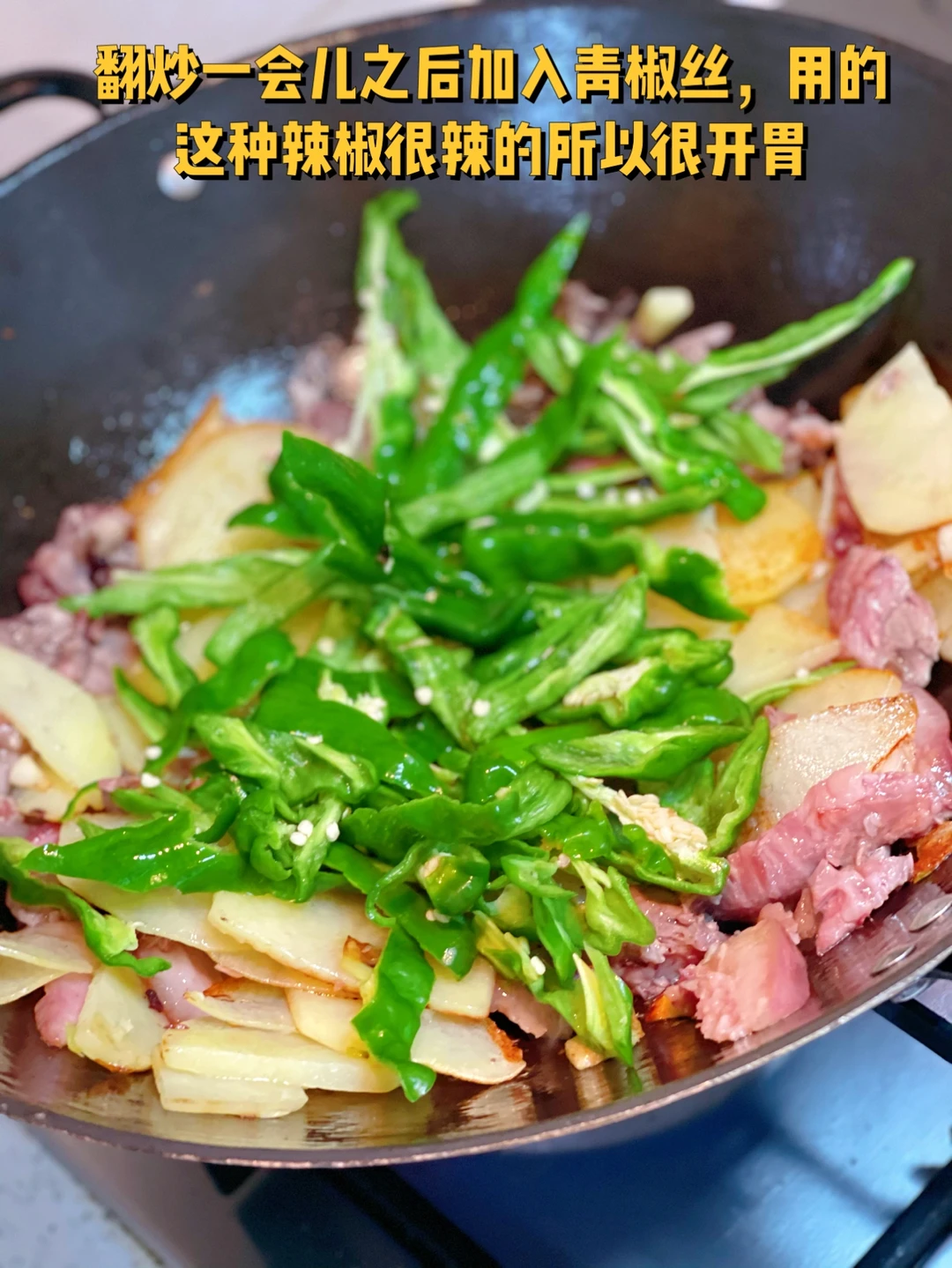 4. 翻炒一会儿之后加入青椒丝,用的这种辣椒很辣的所以很开胃