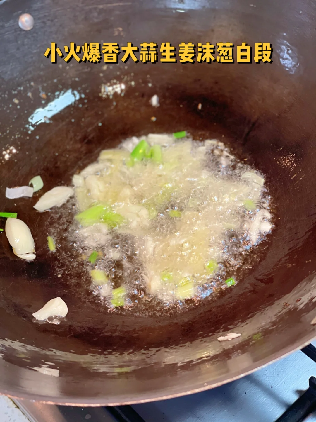 1. 小火爆香大蒜生姜沫葱白段