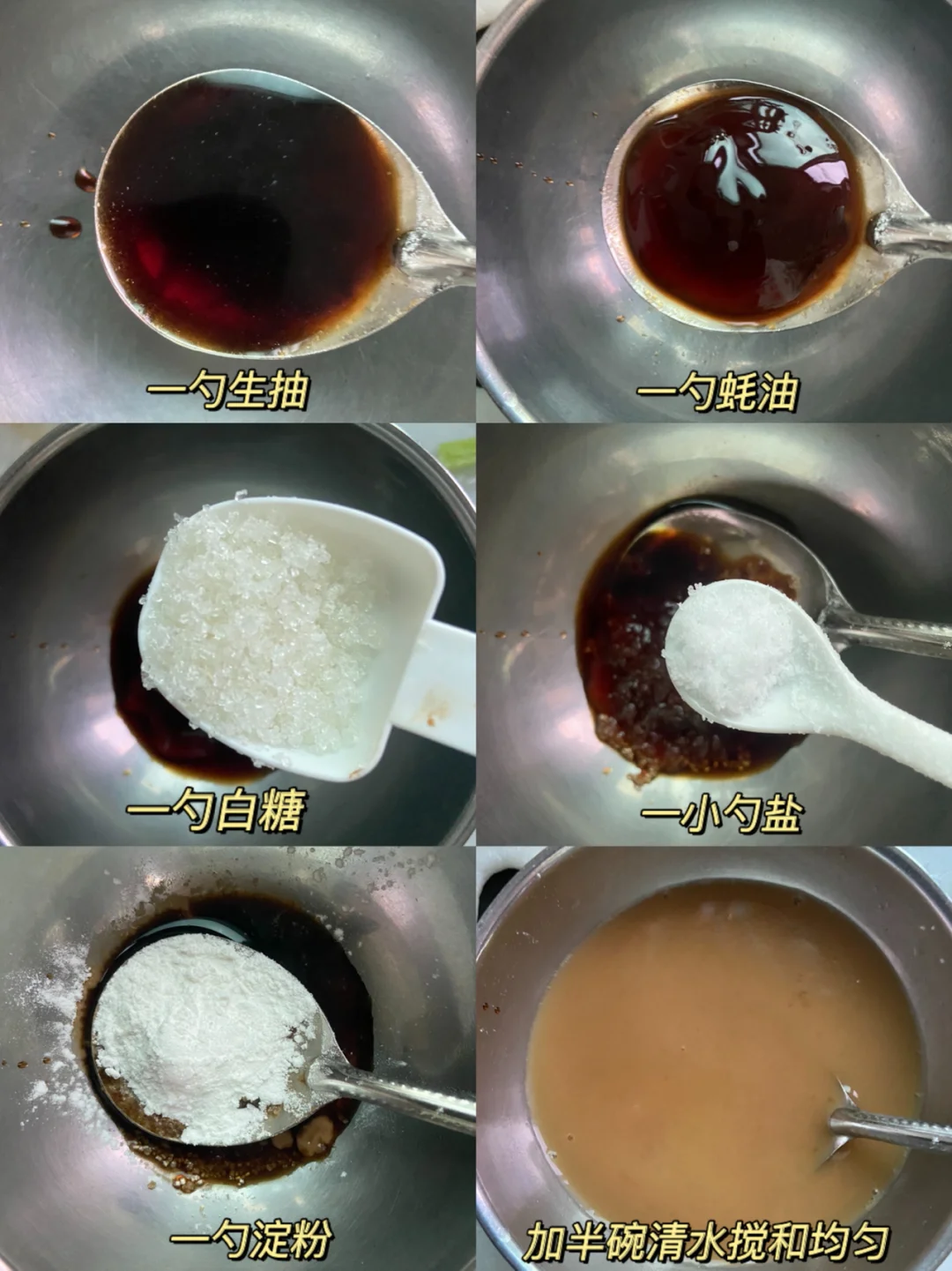2️⃣调一碗酱汁:生抽一勺➕蚝油一勺➕糖一勺➕一小勺盐➕淀粉一勺➕半碗清水