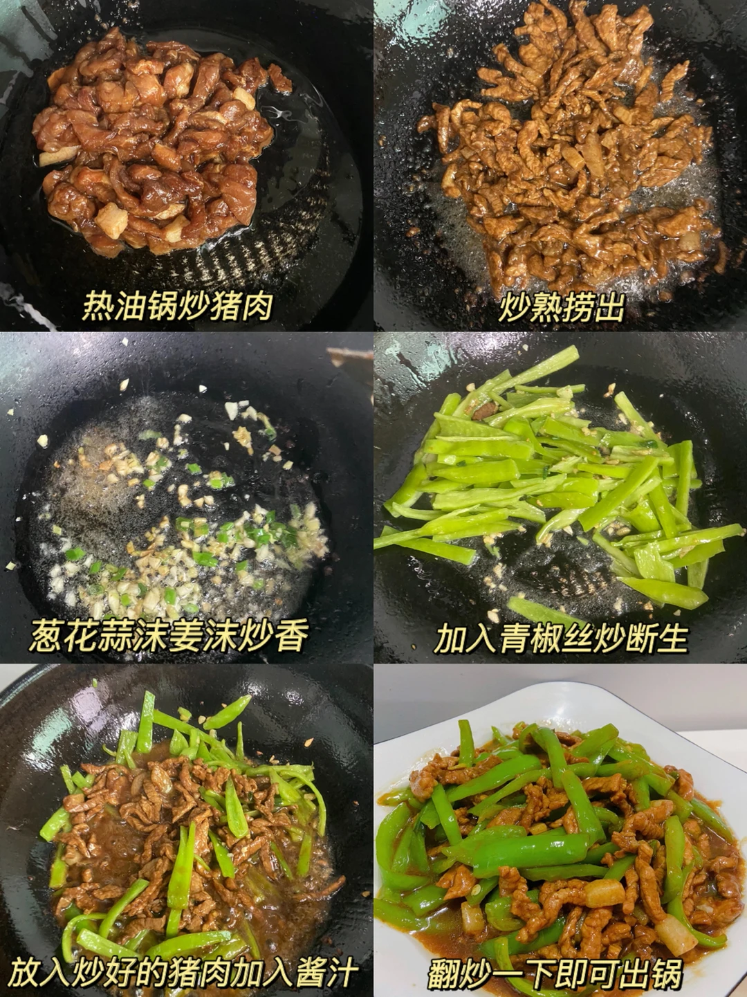 3️⃣青椒切丝 热油锅炒猪肉 炒熟捞出