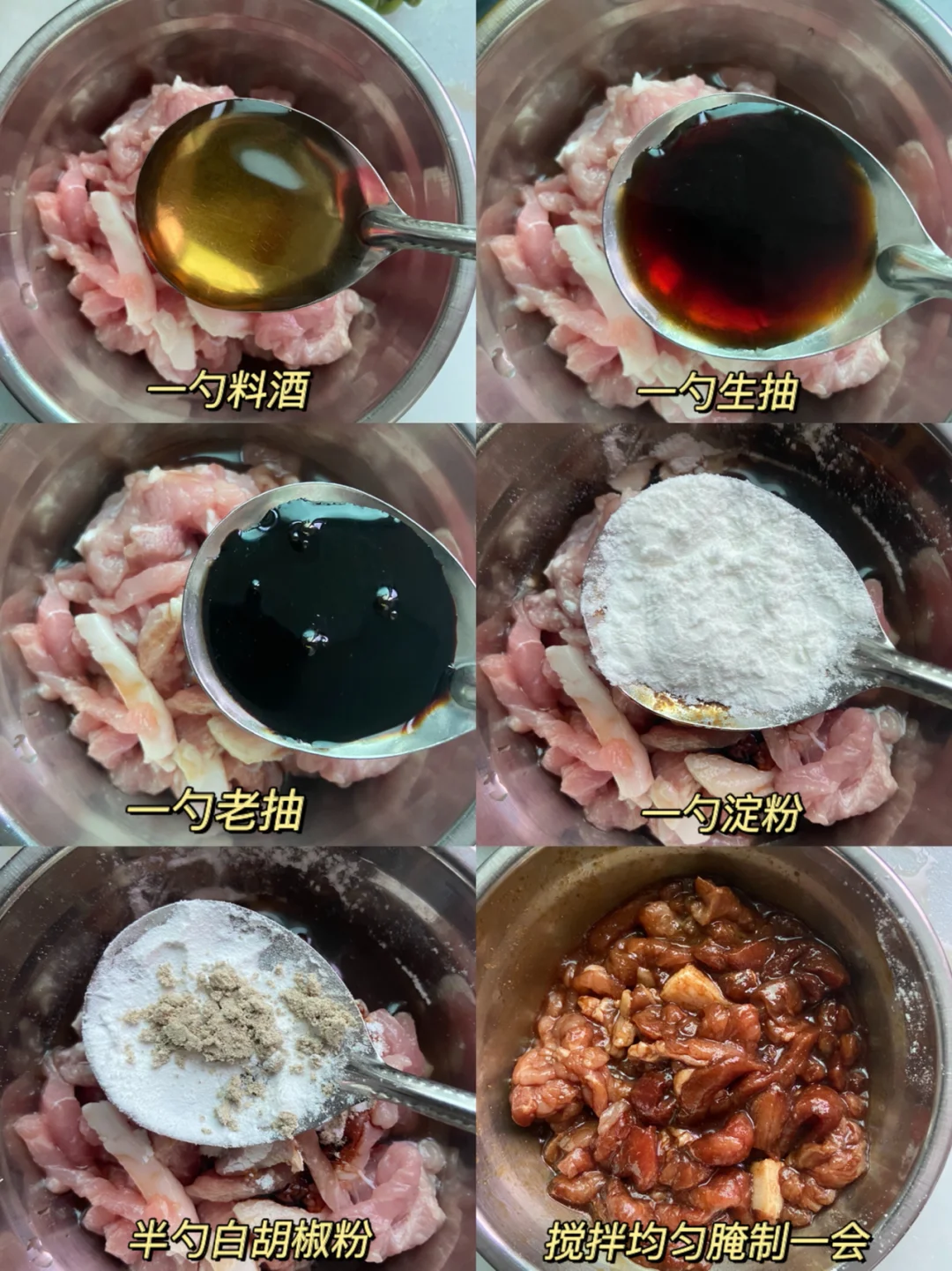 1️⃣猪里脊切丝 ➕一勺料酒➕一勺生抽➕一勺老抽➕一勺淀粉➕半勺胡椒粉抓匀腌制一会