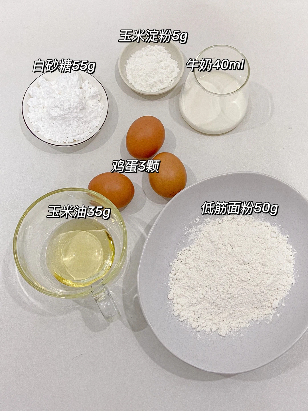 6寸/8寸 鸡蛋3个/6个 玉米油35/60克 纯牛奶40/75克 低筋面粉50/100克 白砂糖55/95克 玉米淀粉5克/10克
