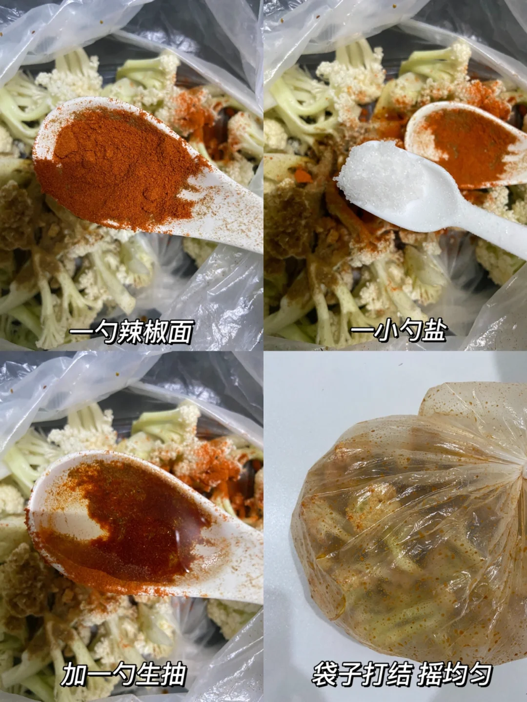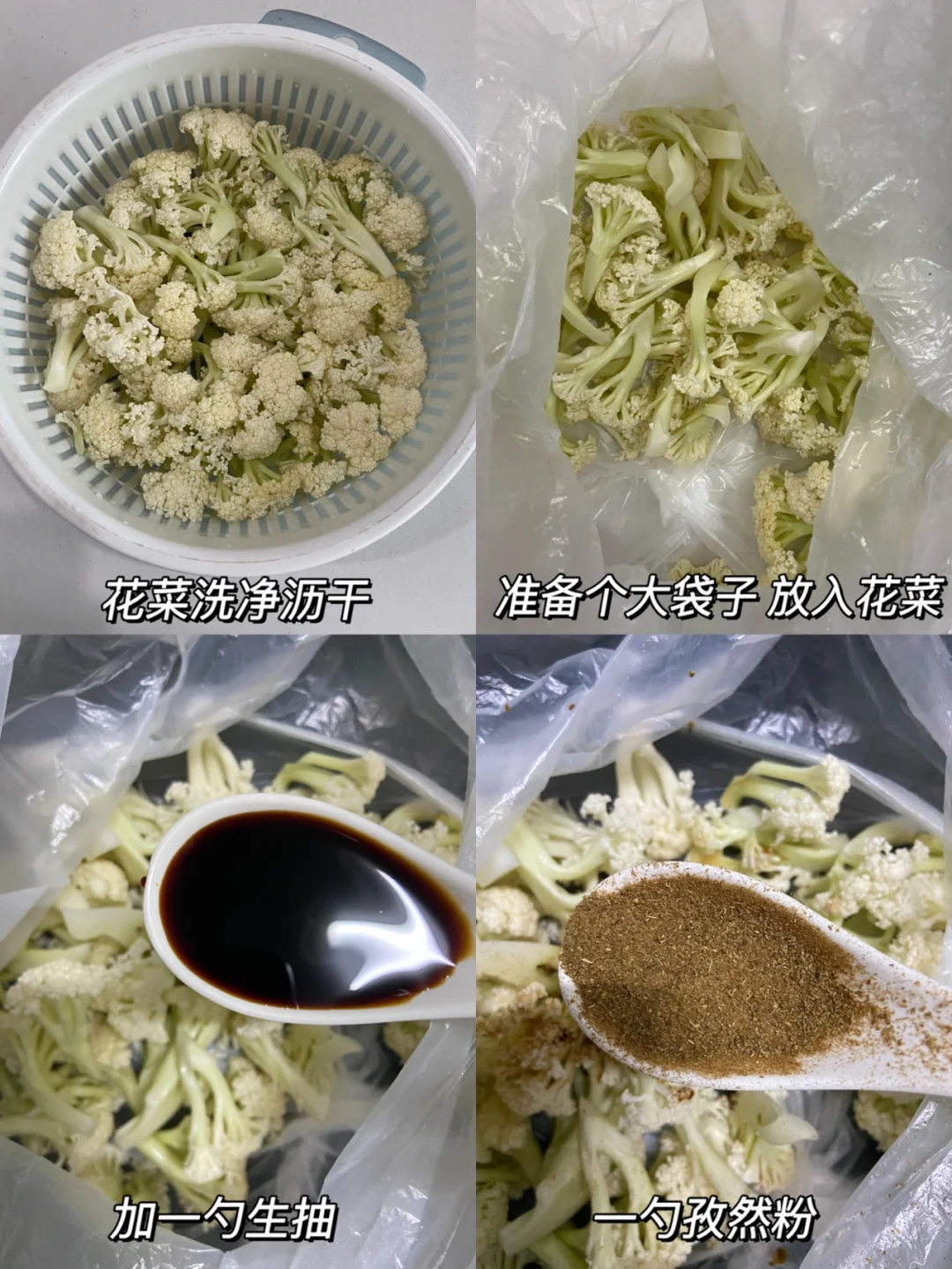 1️⃣花菜洗净用厨房纸吸干水分也可以自然沥干水分