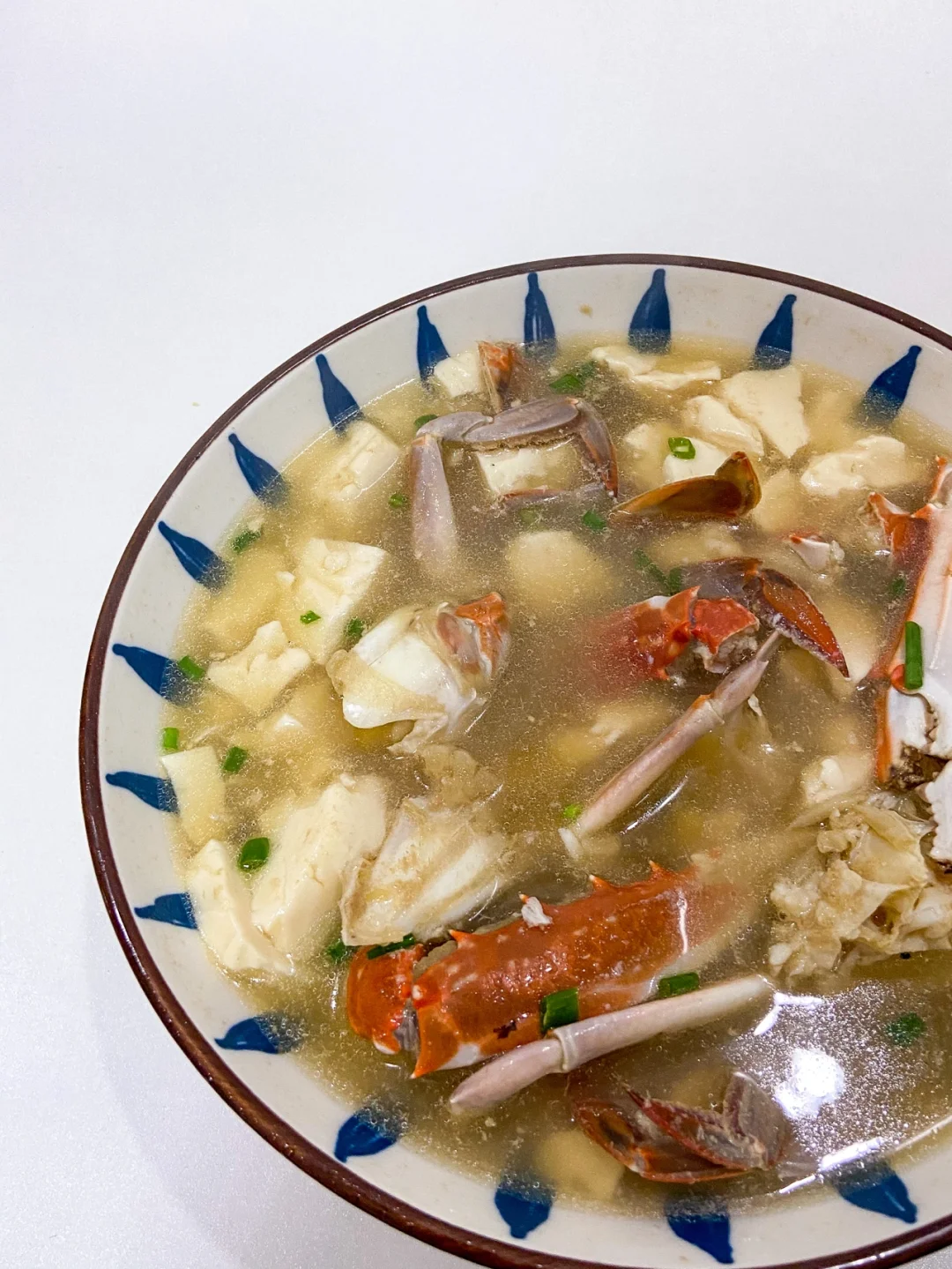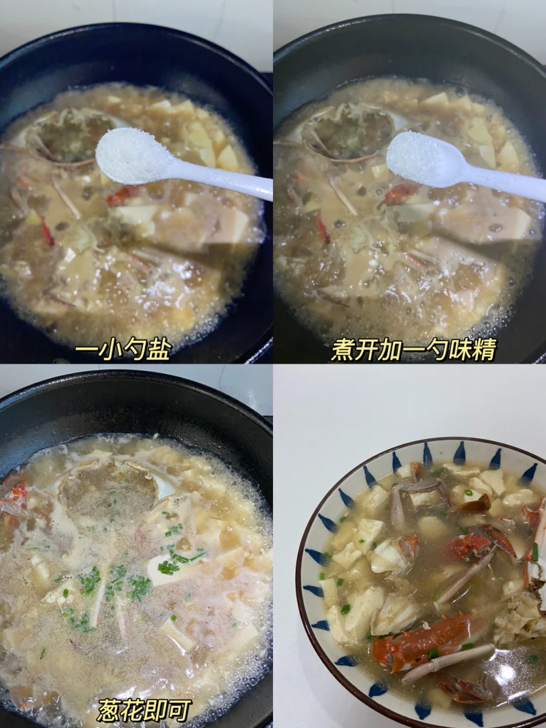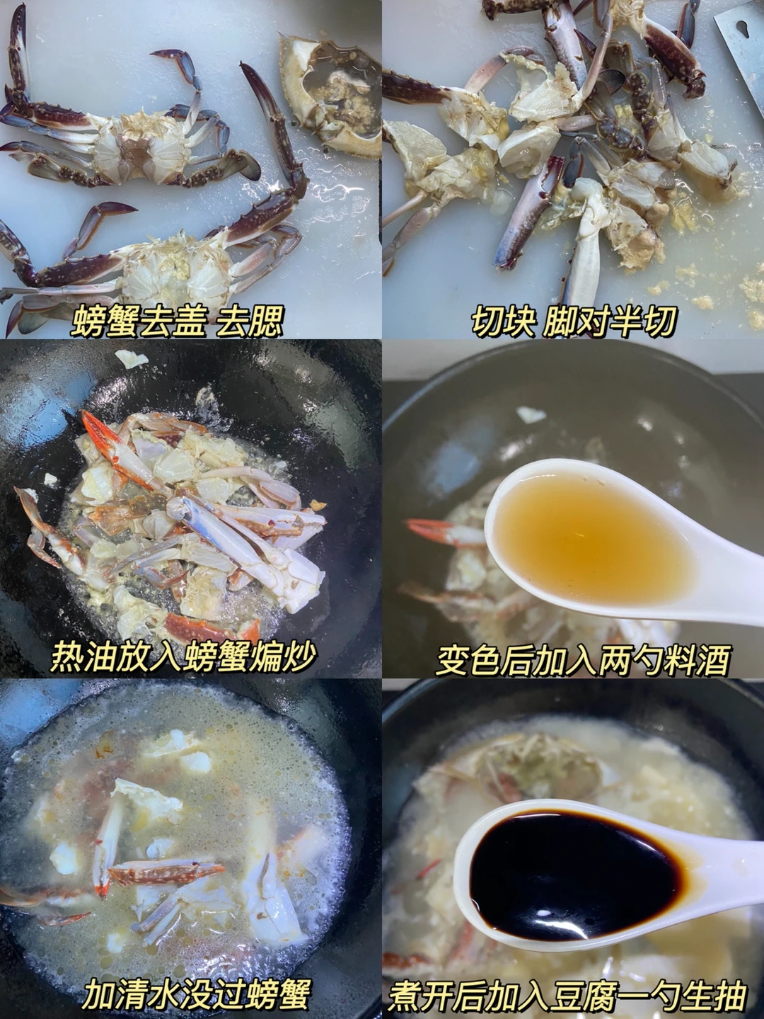 南方人应该都吃过这道菜吧 没到螃蟹季 我妈就会去买很多螃蟹 肥的红烧 瘦的煮汤 真的好吃 鲜到掉毛👍🏻 准备食材✨✨✨✨✨ 梭子蟹两只 豆腐 葱花 做法✨✨✨✨✨ 1️⃣螃蟹去盖 去腮 切块 脚对半切 2️⃣热油放入螃蟹煸炒 变色后加入两勺料酒 加清水没过螃蟹 3️⃣煮开后加入豆腐 一勺生抽 一勺盐 4️⃣煮开加一勺味精葱花即可
