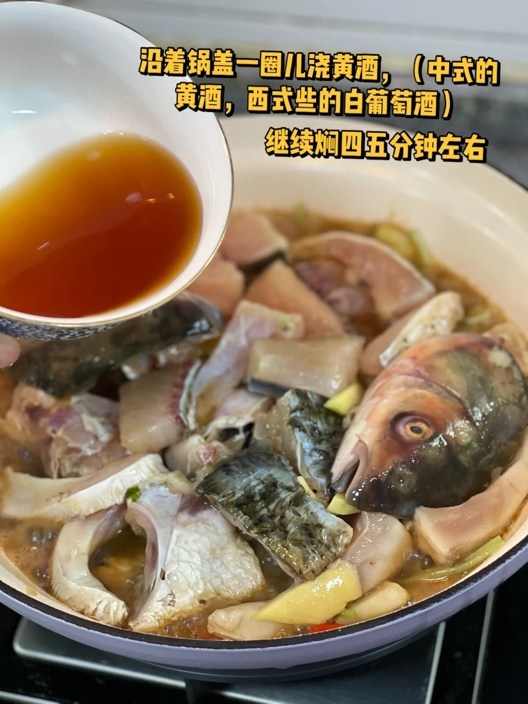 6. 沿着锅盖一圈儿浇黄酒,(中式的黄酒,西式些的白葡萄酒)继续焖四五分钟左右