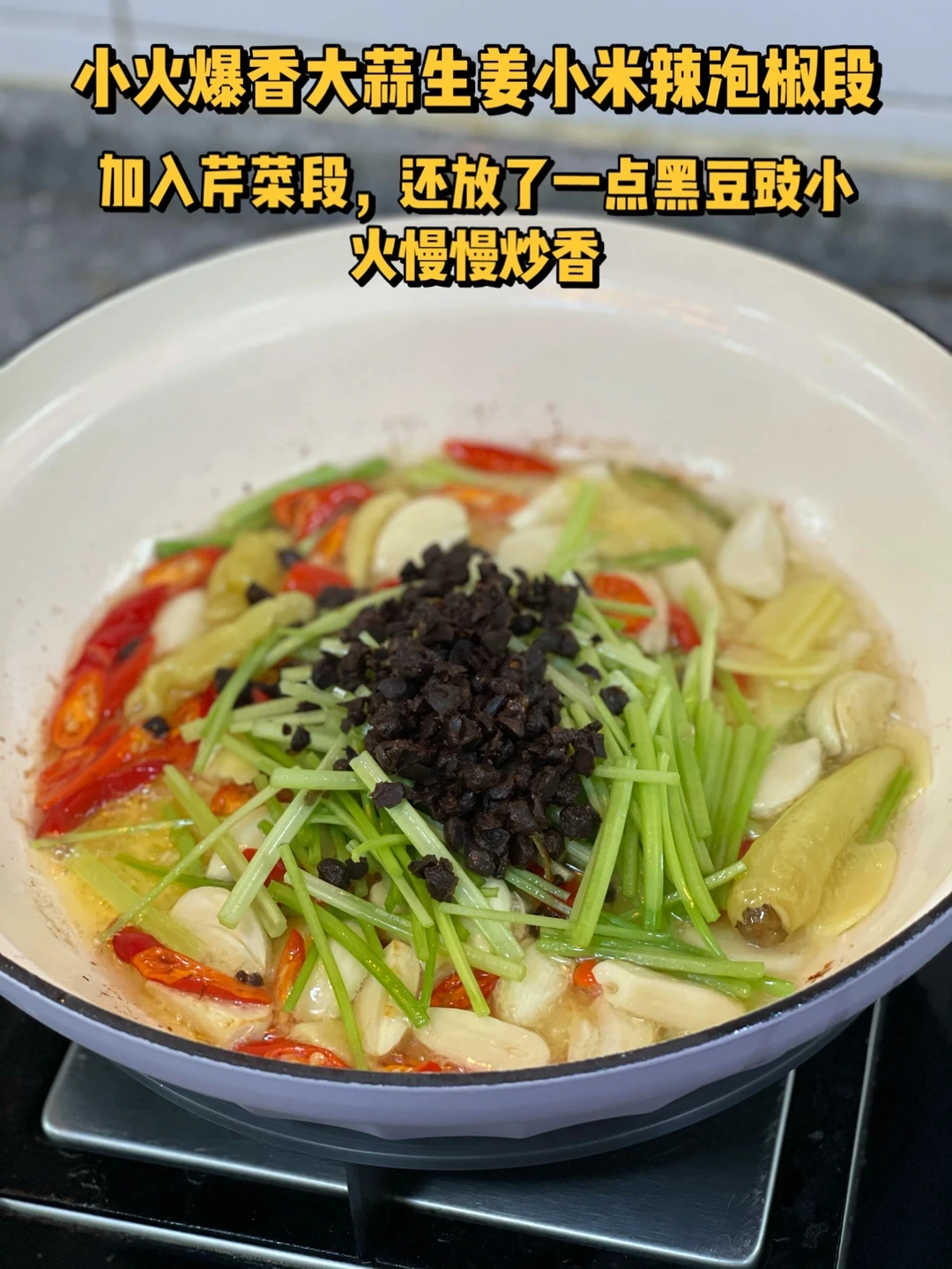 4. 小火爆香大蒜生姜小米辣泡椒段,加入芹菜段,还放了一点黑豆豉小火慢慢炒香