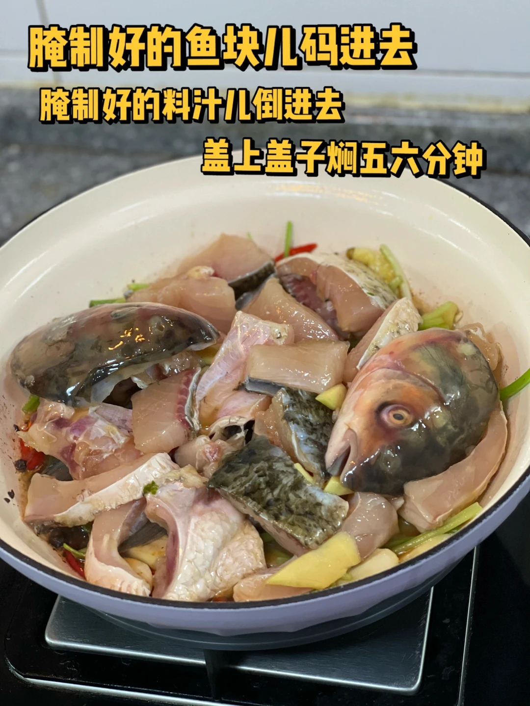 5. 腌制好的鱼块儿码进去,腌制好的料汁儿倒进去,盖上盖子焖五六分钟