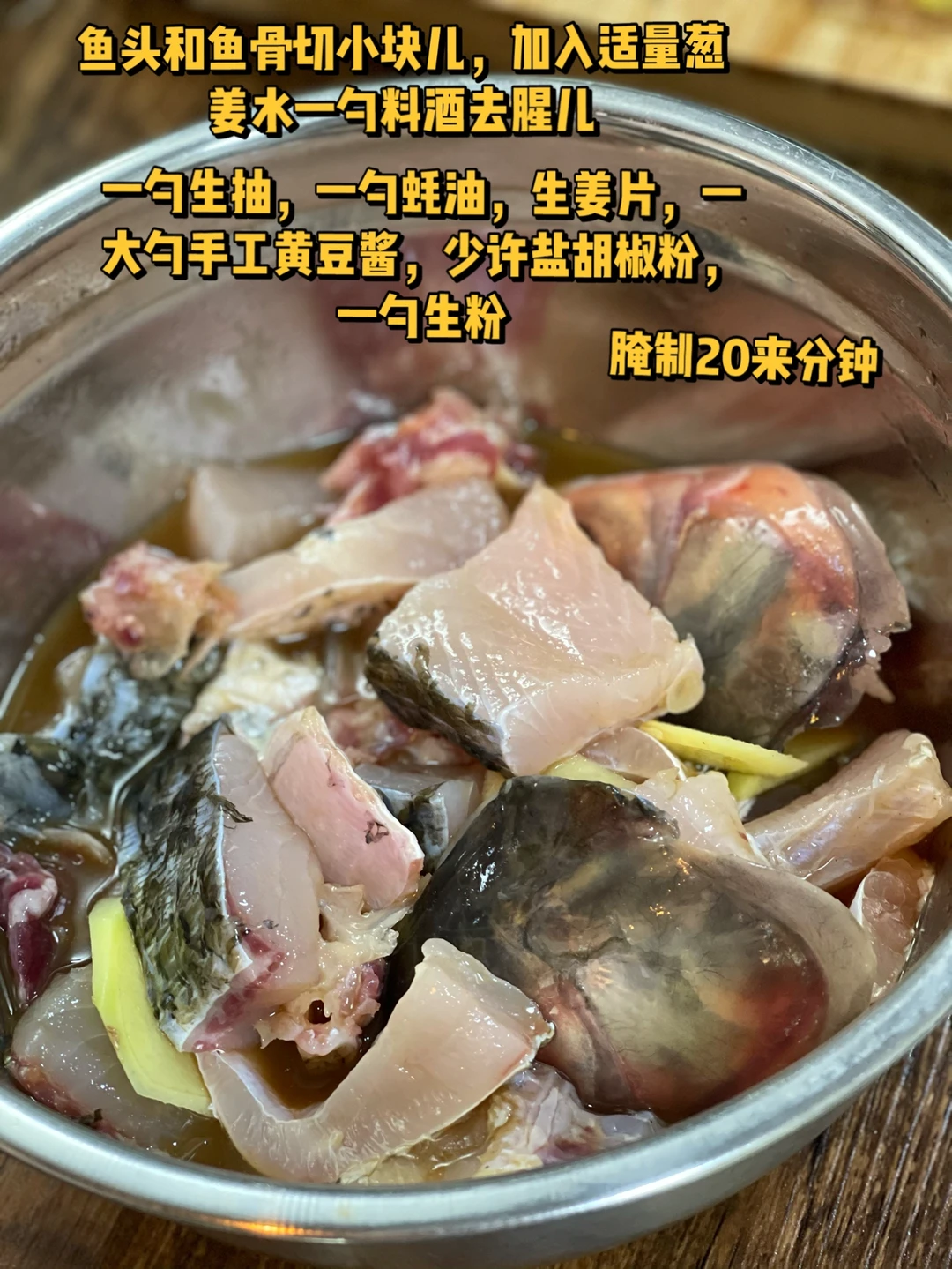 2.鱼头和鱼骨切小块儿,加入适量葱姜水一勺料酒去腥儿,一勺生抽,一勺蚝油,一大勺手工黄豆酱,少许盐胡椒粉,一勺生粉,腌制20来分钟
