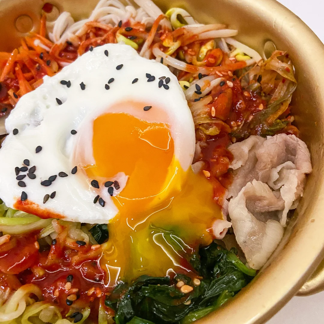 4️⃣摆盘将米饭盛入碗中压压平她食材铺到饭上 正中间放上一颗蛋 搭配少许泡菜 撒上熟芝麻 淋上酱汁 最后酱汁倒到食材上 与蛋一同搅散拌匀即可开动😊