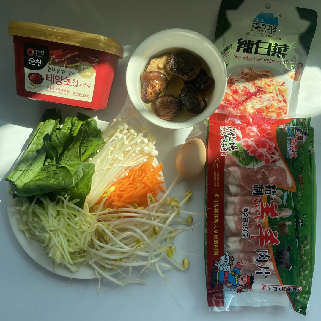 香菇5朵 金针菇一小把 肥牛羊卷适量(可根据自己喜欢的菜加) 鸡蛋一颗 辣白菜一小碗