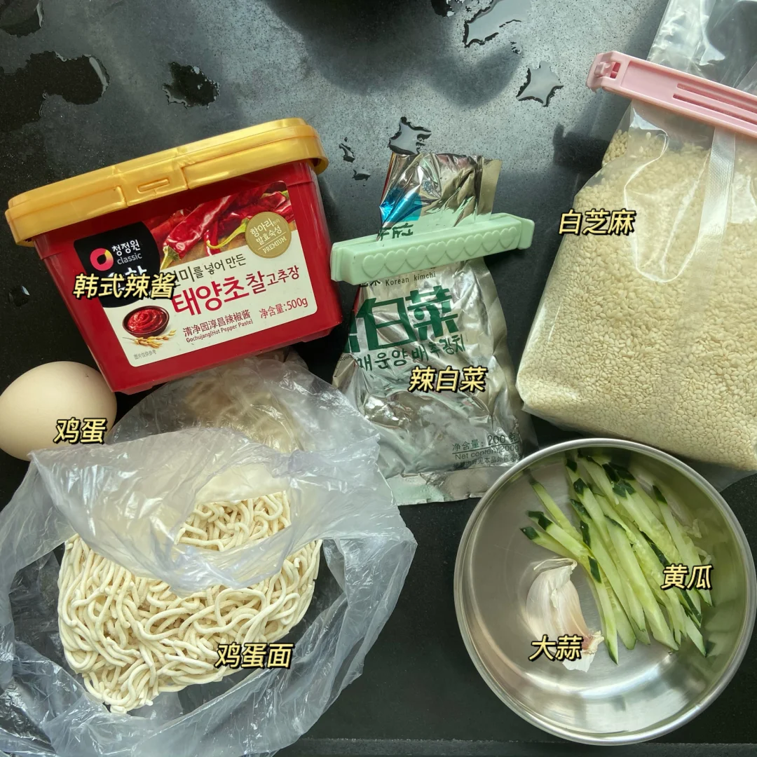 鸡蛋面 辣白菜 黄瓜 鸡蛋 大蒜 白芝麻 韩式辣酱