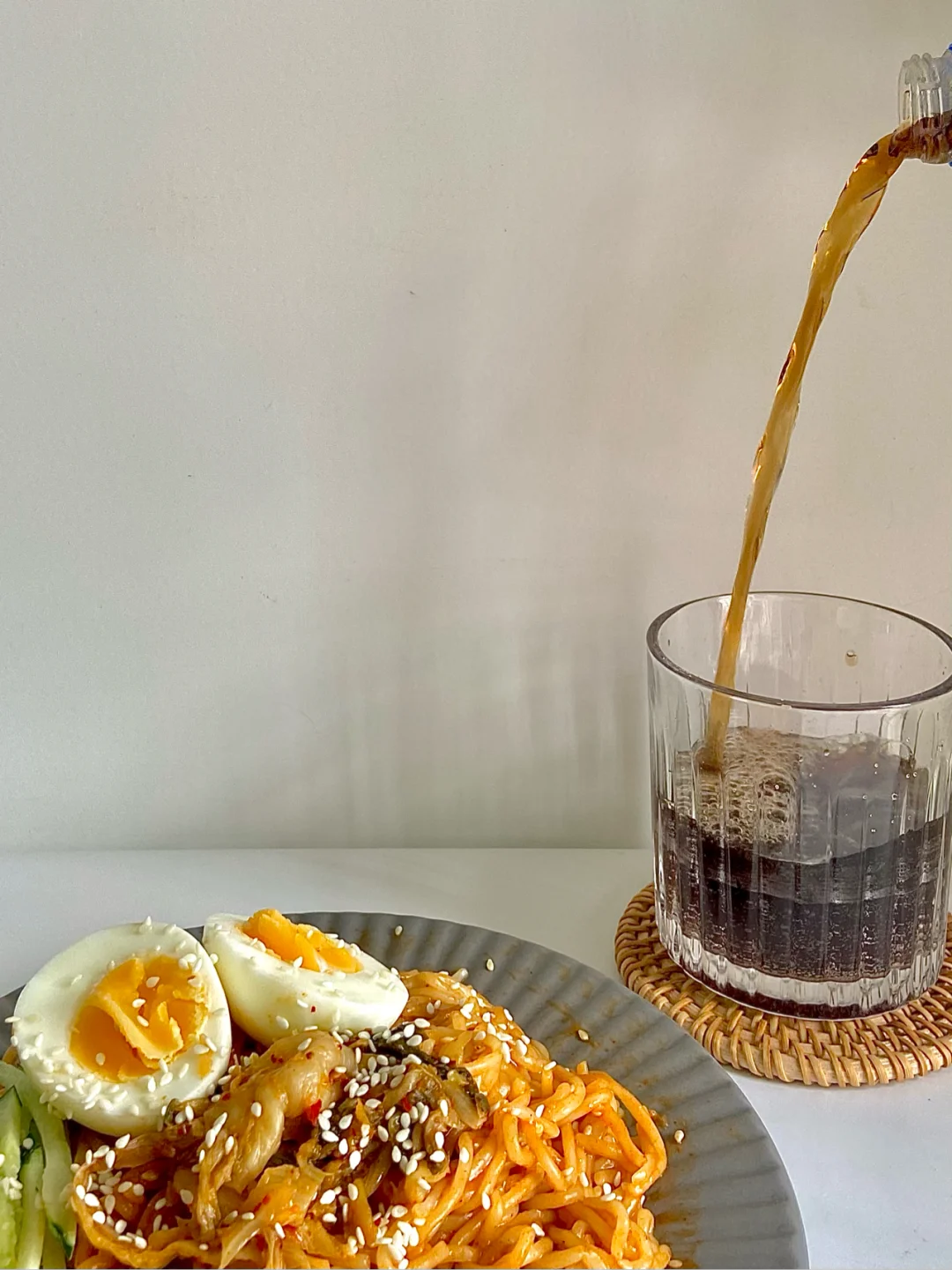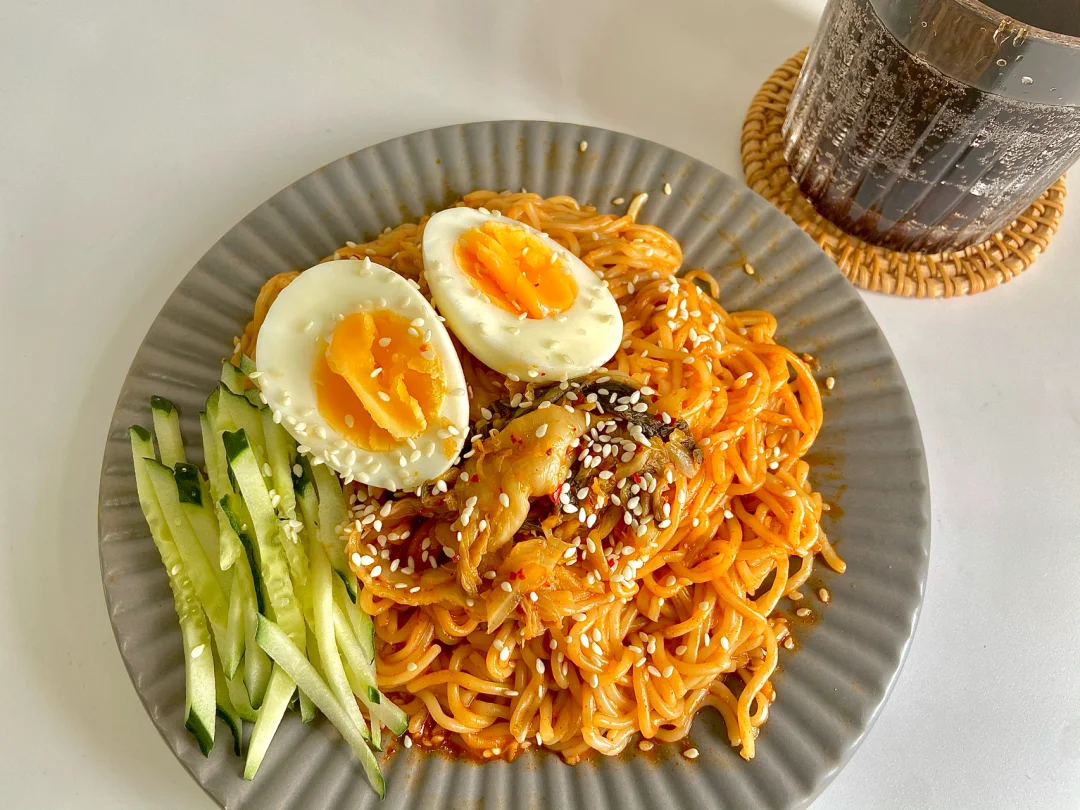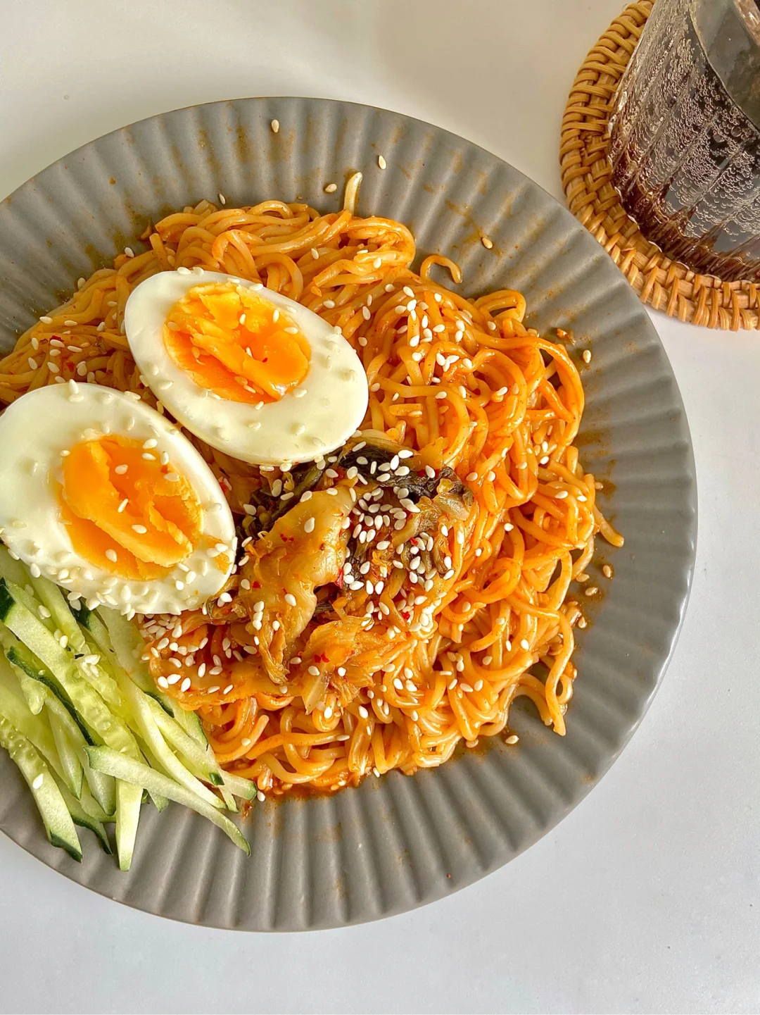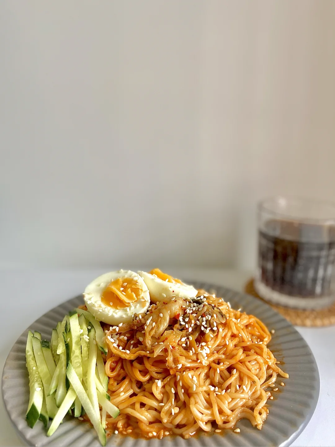 吃过韩国拌饭怎么能错过韩国拌面呢!今天一个人在家 索性几天拿出冰箱的备用品做了一份 太好吃啦[萌萌哒R]