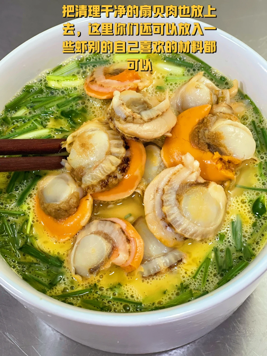 6. 把清理干净的扇贝肉也放上去,这里你们还可以放入一些虾别的自己喜欢的材料都可以