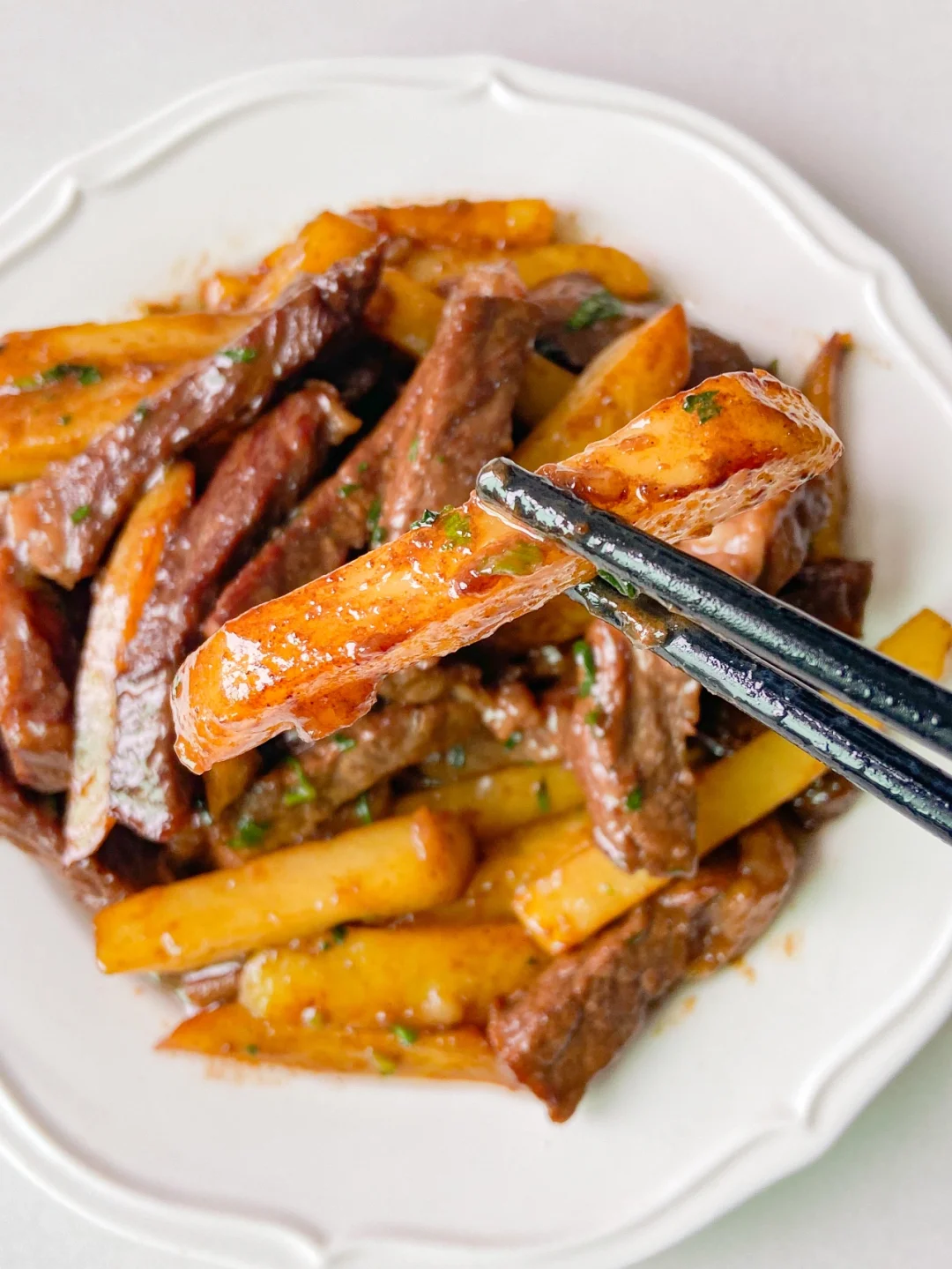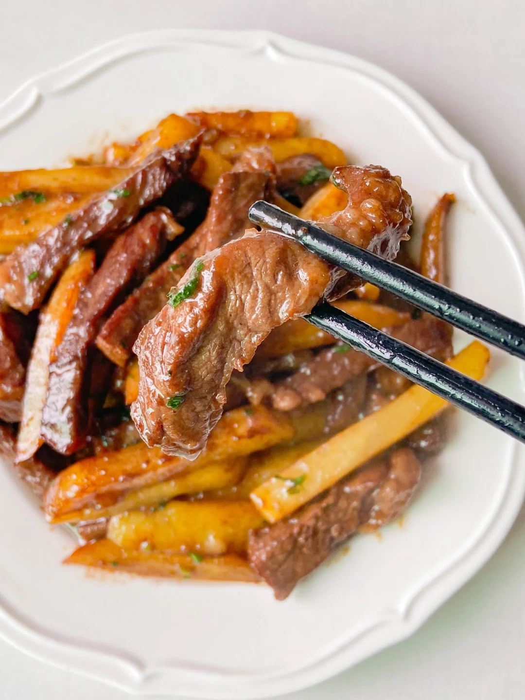 坠近看到好多人在做牛肉炒土豆条也有点馋了 买了牛排也安排起来 香味扑鼻巨下饭🍚