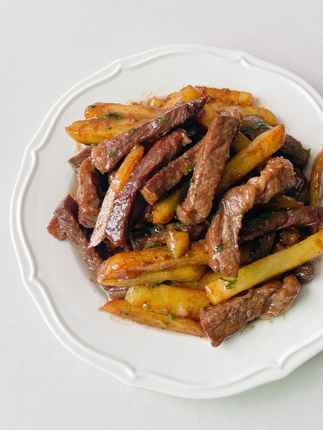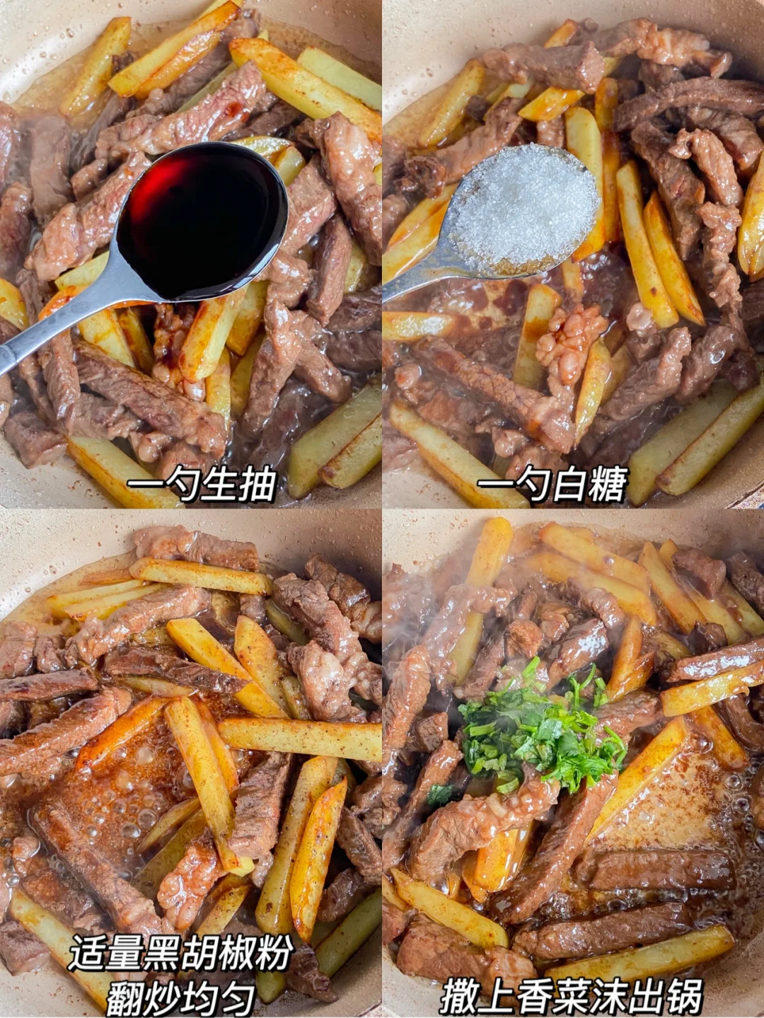 4️⃣锅中加入牛肉条煎熟 再加入土豆 ➕1勺蚝油➕一勺生抽➕一勺白糖➕适量黑胡椒粉翻炒均匀 撒上香菜沫出锅✔️