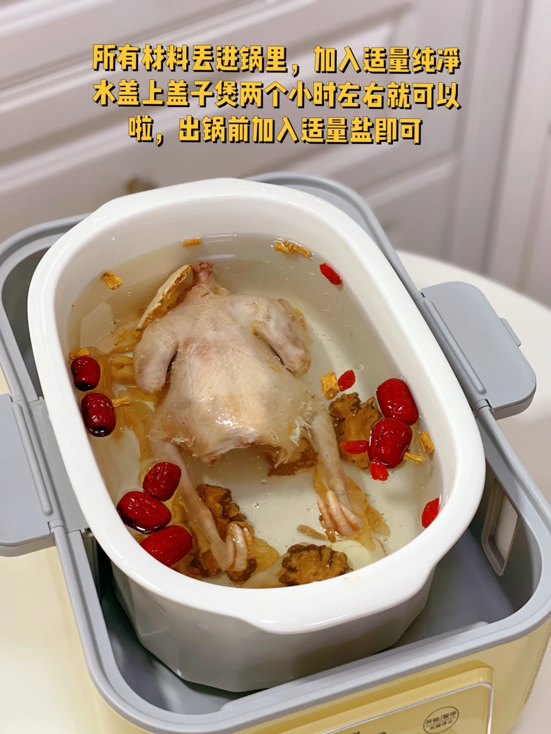 4.鸽子和配料全部放进炖盅里,如果怕上火的话红枣可以去核哦,加入适量纯净水
