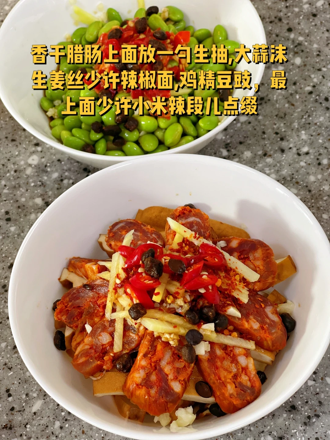 麻辣香肠蒸香干,剁椒毛豆米做法: