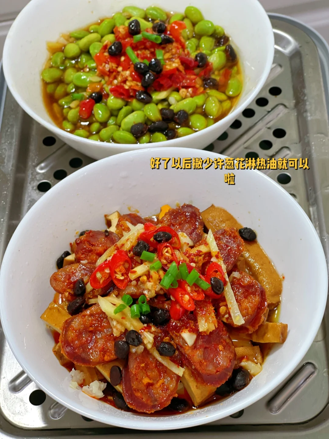 5.蒸好以后淋少许热油撒葱花就可以开吃啦 其实做之前我也挺担心成品味道的 没有想到的是香干吸收了腊肠的香气 回味无穷啊,有点超乎我的意外 毛豆因为有剁椒,够辣够味儿也很好吃