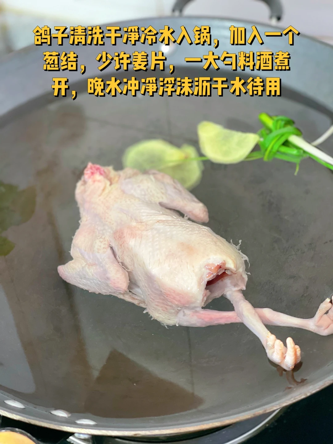 2.鸽子清理干净毛毛和内脏 冷水入锅,加入葱结和姜片 一大勺料酒开始煮