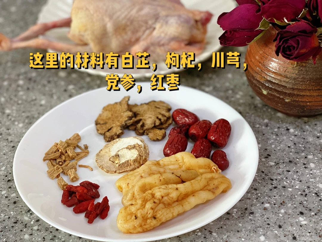 1.这里的食材有天麻[朋友拿来的时候是晒干的,我泡了一个晚上,入锅前切片了] 白芷,红枣,川芎,党参,枸杞