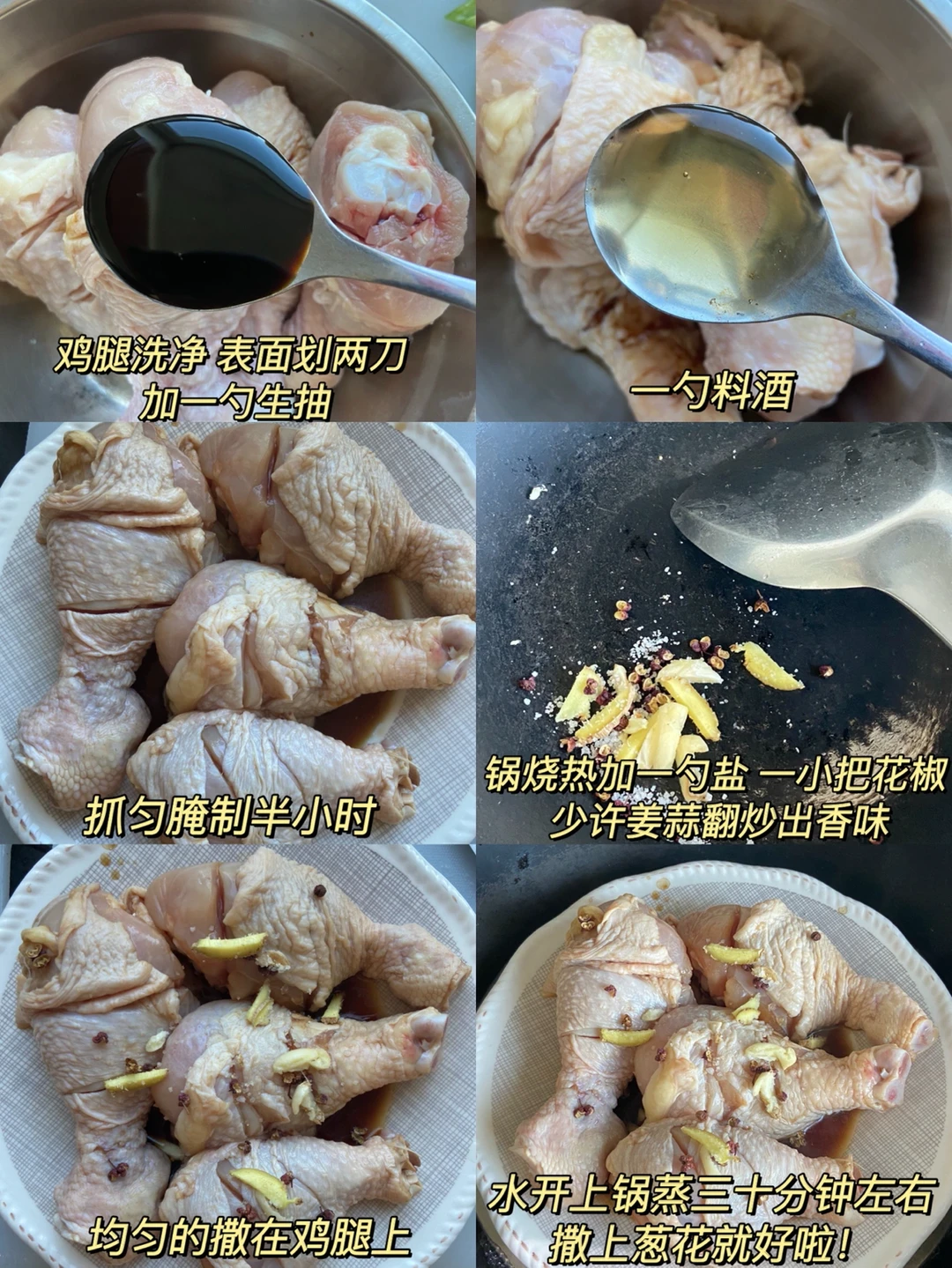 这个椒盐蒸鸡腿不加一滴油喔 吃起来巨嫩无比 特别好吃 做法很简单! 准备食材:✨✨✨✨✨ 鸡腿3个 盐少许 花椒1小把 料酒1勺 生抽1勺1️⃣鸡腿洗净 表面划两刀 加一勺生抽和一勺料酒 抓匀腌制半小时 2️⃣平底锅烧热加一勺盐 一小把花椒 少许姜蒜翻炒出香味 3️⃣均匀的撒在鸡腿上 水开上锅蒸三十分钟左右最后撒上葱花就好啦!