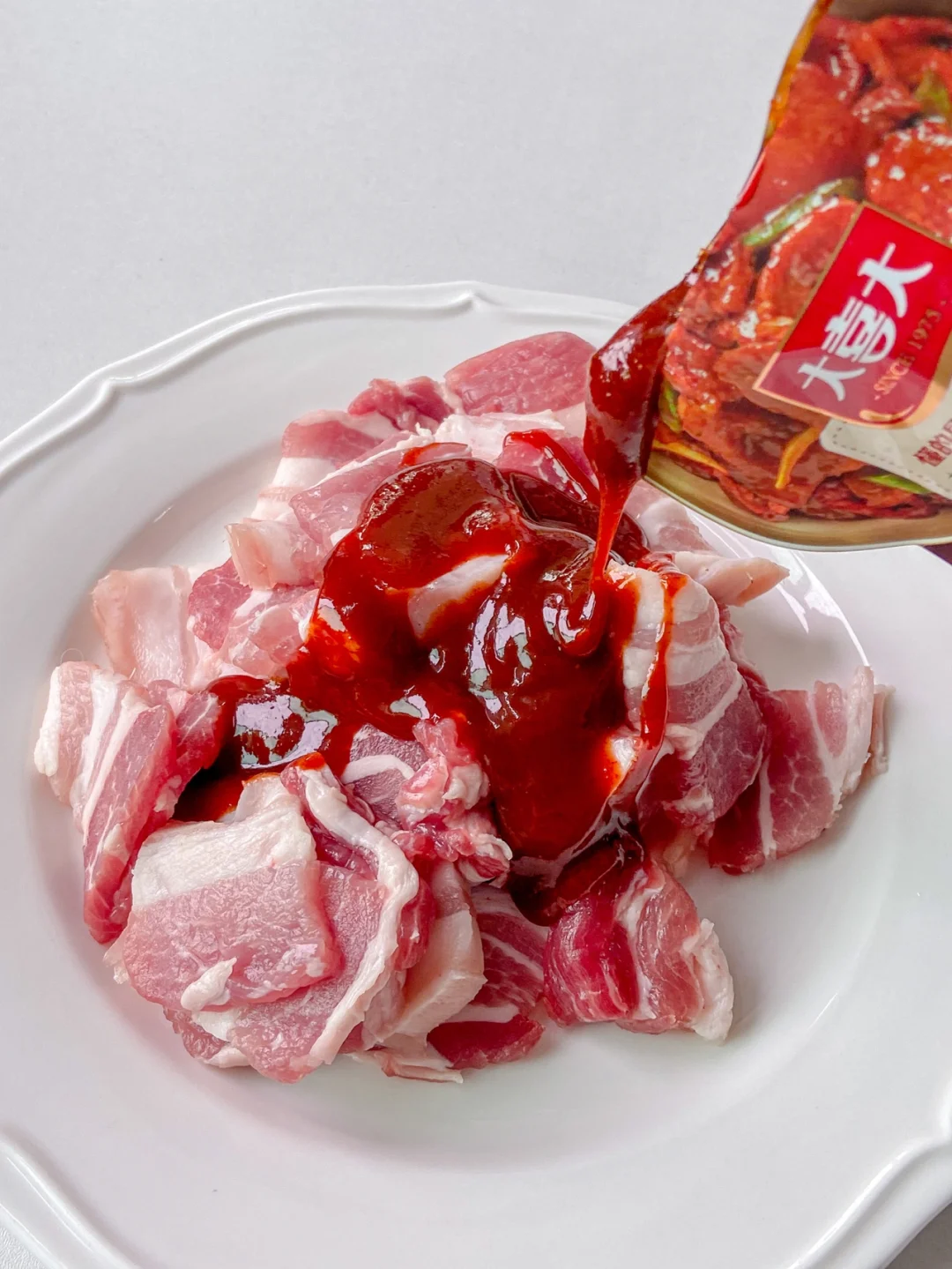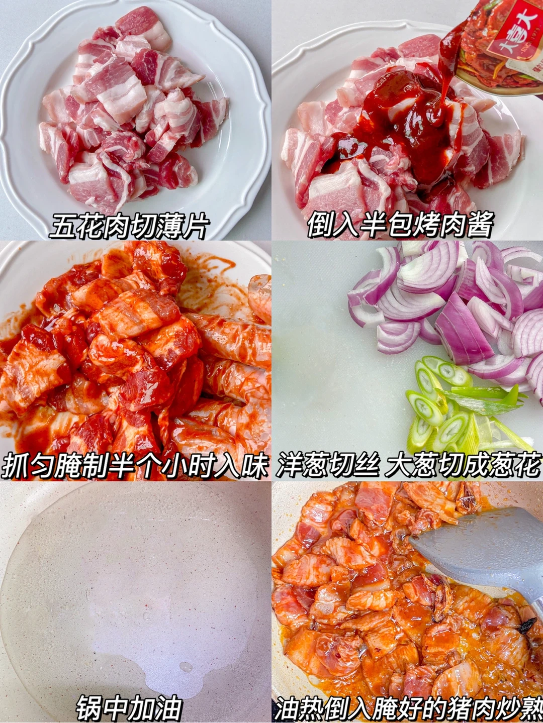 1️⃣猪肉切薄片 倒入半包烤肉酱 抓匀腌制半个小时入味