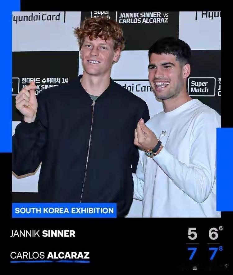 被重金吸引到韩国的辛纳和阿尔卡拉斯在仁川打了一场表演赛,中间还曾把一位韩国男孩换上来打了几拍,最终阿卡以7-5、7-6(6)“险胜”,据称,这趟韩国之旅让两人都拿到了200万欧元的出场费,几乎和澳网夺冠的奖金接近,赚钱效率超高,换算下来差不多每分钟赚1.8万欧元。