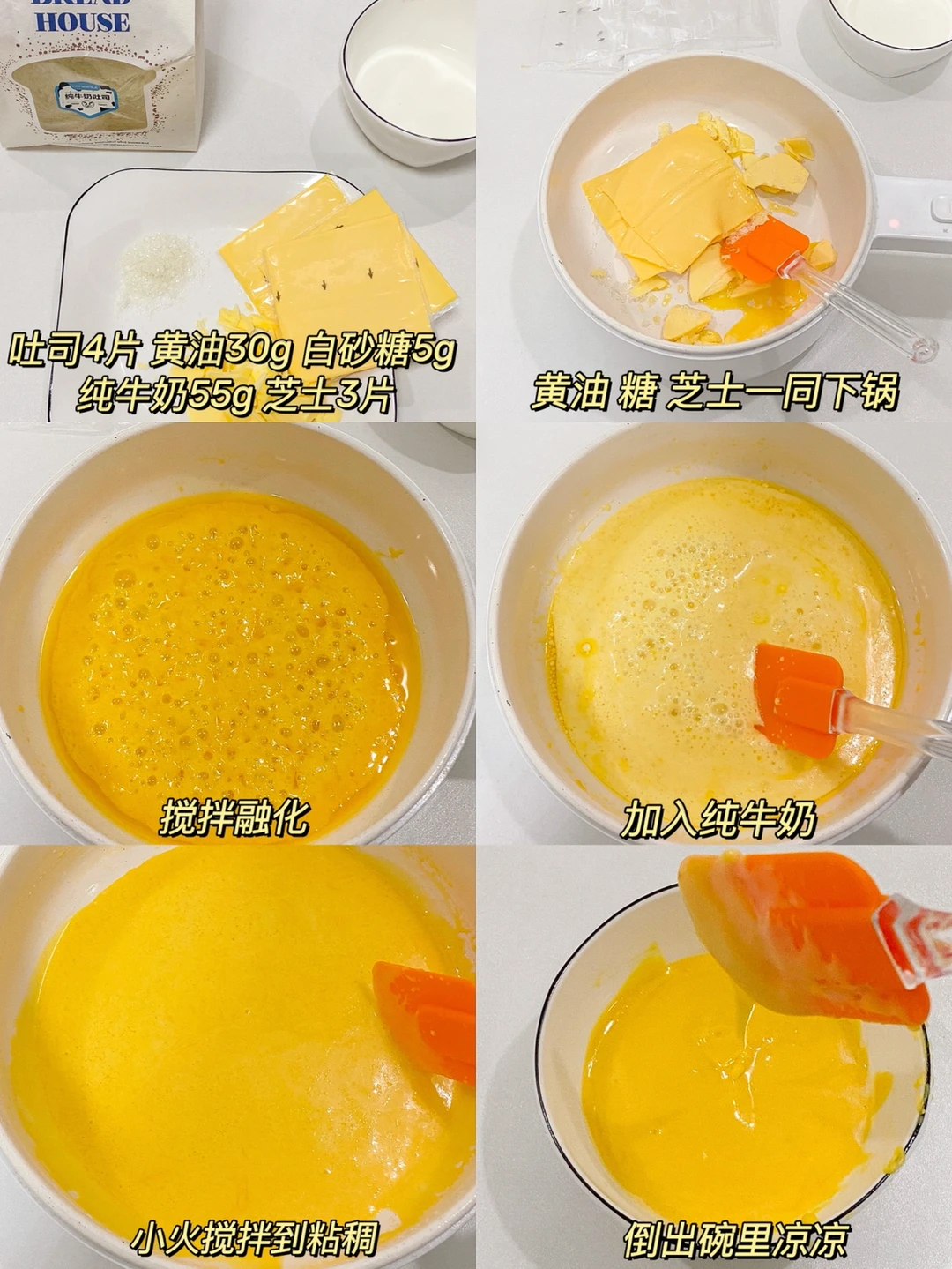 吐司4片 黄油30g 白砂糖5g 纯牛奶55g 芝士3片(可以把牛奶换成10g➕淡奶油45g 会更香甜)