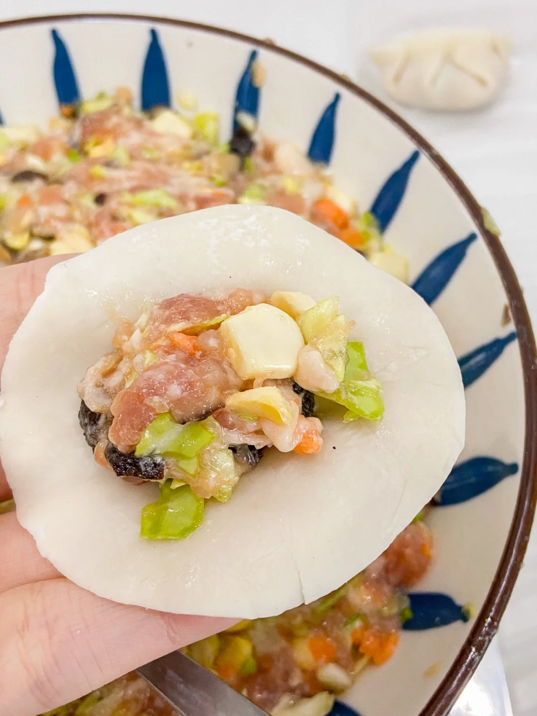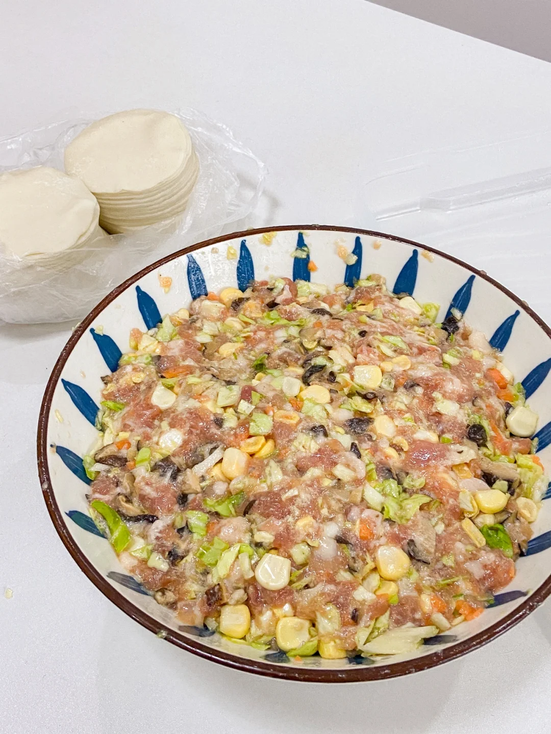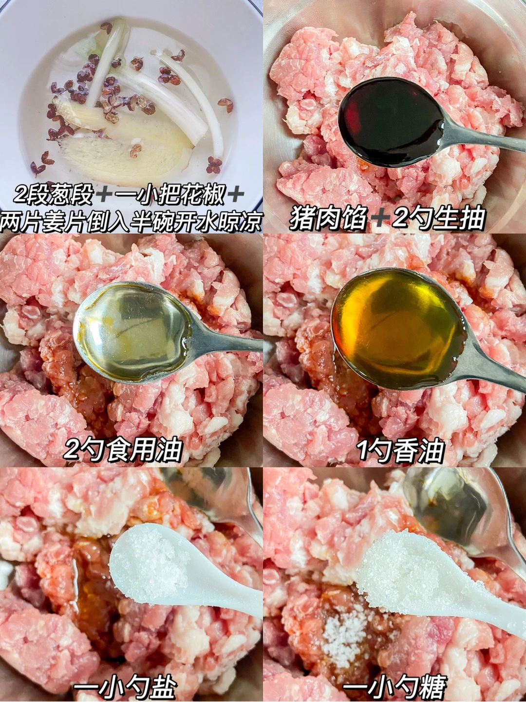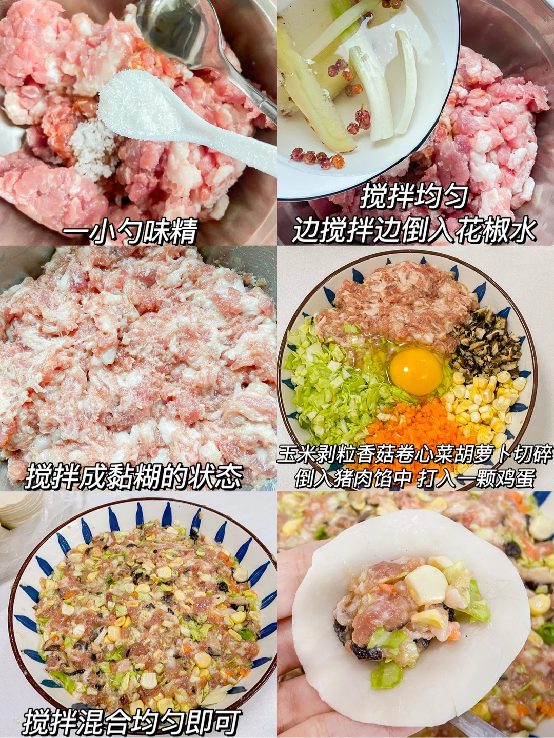 每次包饺子大家伙们都问我放了啥 每次都被抢着吃😌今天分享给大家 准备食材✨✨✨✨✨ 猪肉馅300g 香菇6朵 玉米一个 卷心菜小半个胡萝卜半根 鸡蛋一颗 葱段 花椒 姜片 做法✨✨✨✨✨ 1️⃣2段葱段➕一小把花椒➕两片姜片倒入半碗开水晾凉 2️⃣猪肉馅➕2勺生抽➕2勺食用油➕1勺香油➕一小勺盐➕1小勺糖➕一小勺味精 搅拌均匀 边搅拌边倒入花椒水 3️⃣玉米剥粒 香菇 卷心菜 胡萝卜切碎 倒入猪肉馅中 打入一颗鸡蛋 搅拌混合均匀即可 上桌秒光盘 煎蒸煮都好吃 快来试试叭🤗