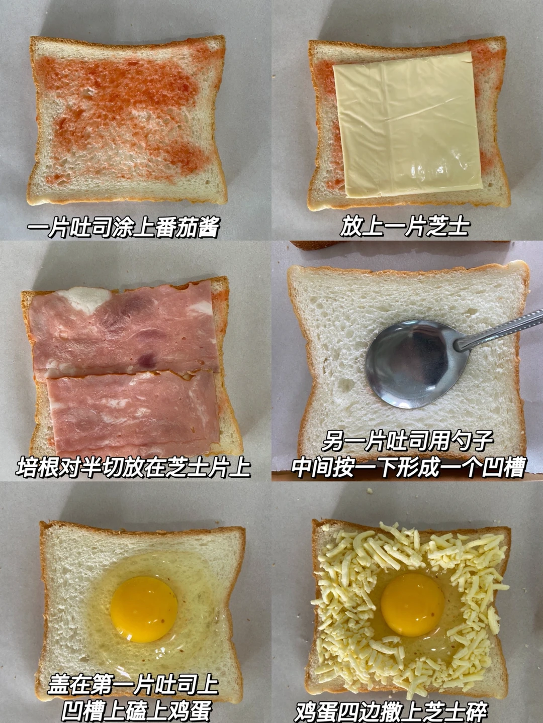 2️⃣另一片吐司用勺子中间按一下形成一个凹槽 放在第一片吐司上