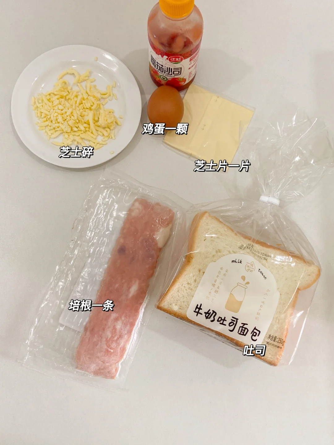 吐司 鸡蛋 培根 芝士片 沙拉酱 番茄酱