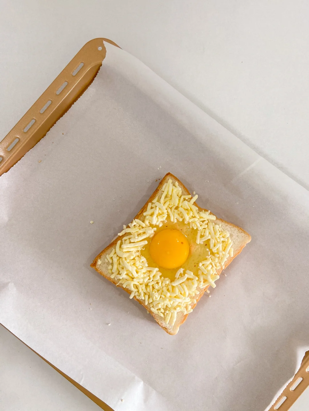 3️⃣在凹槽打上鸡蛋 鸡蛋四边撒上芝士碎或沙拉酱