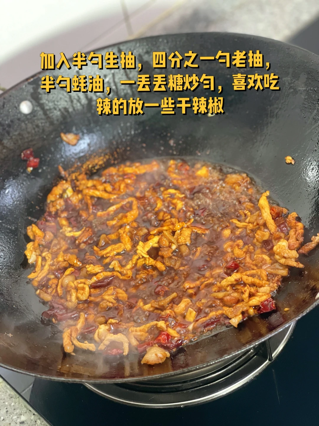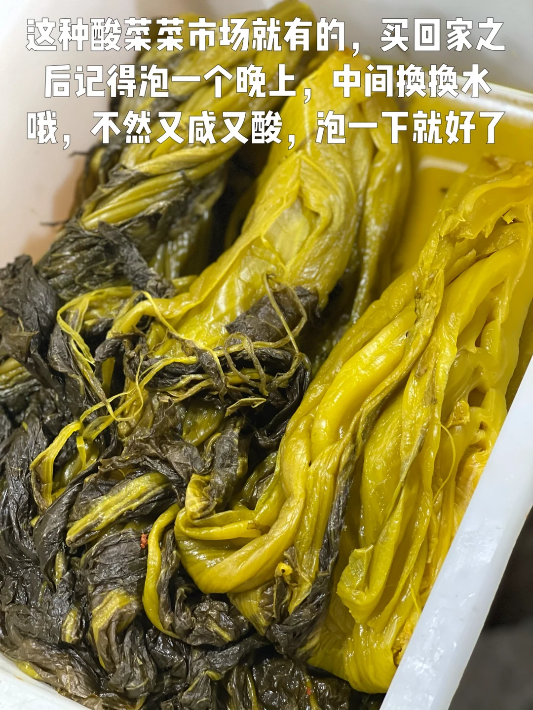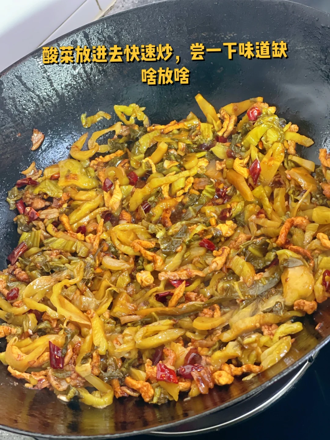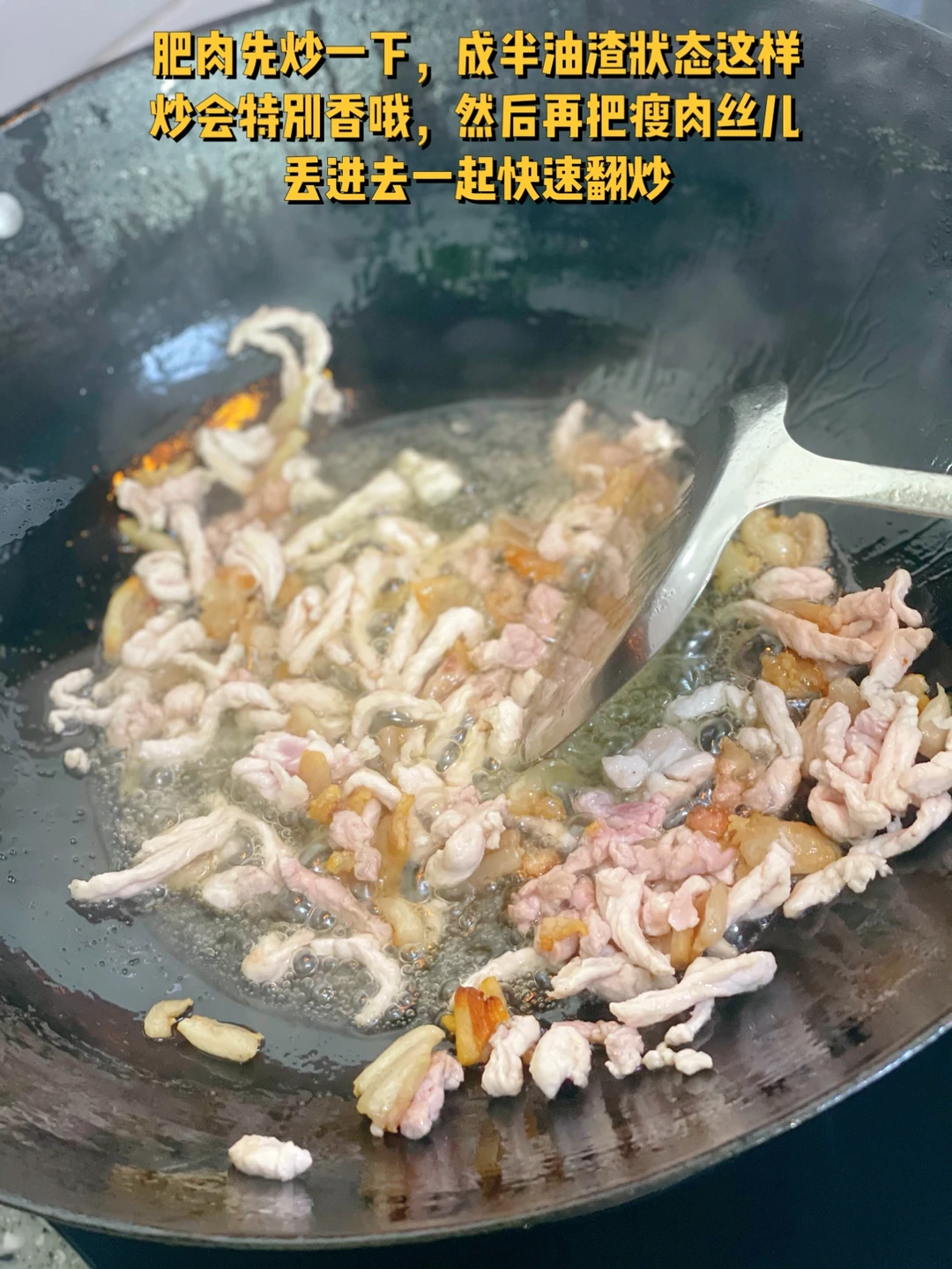 酸菜炒肉丝: 1. 这种酸菜菜市场就有的,买回家之后记得泡一个晚上,中间换换水哦,不然又咸又酸,泡一下就好了 2. 切成均匀的细丝儿 3. 肥肉先炒一下,成半油渣状态这样炒会特别香哦,然后再把瘦肉丝儿丢进去一起快速翻炒 4. 加入半勺生抽,四分之一勺老抽,半勺蚝油,一丢丢糖炒匀,喜欢吃辣的放一些干辣椒 5. 酸菜放进去快速炒,尝一下味道缺啥放啥 6. 最后放鸡粉,葱花出锅