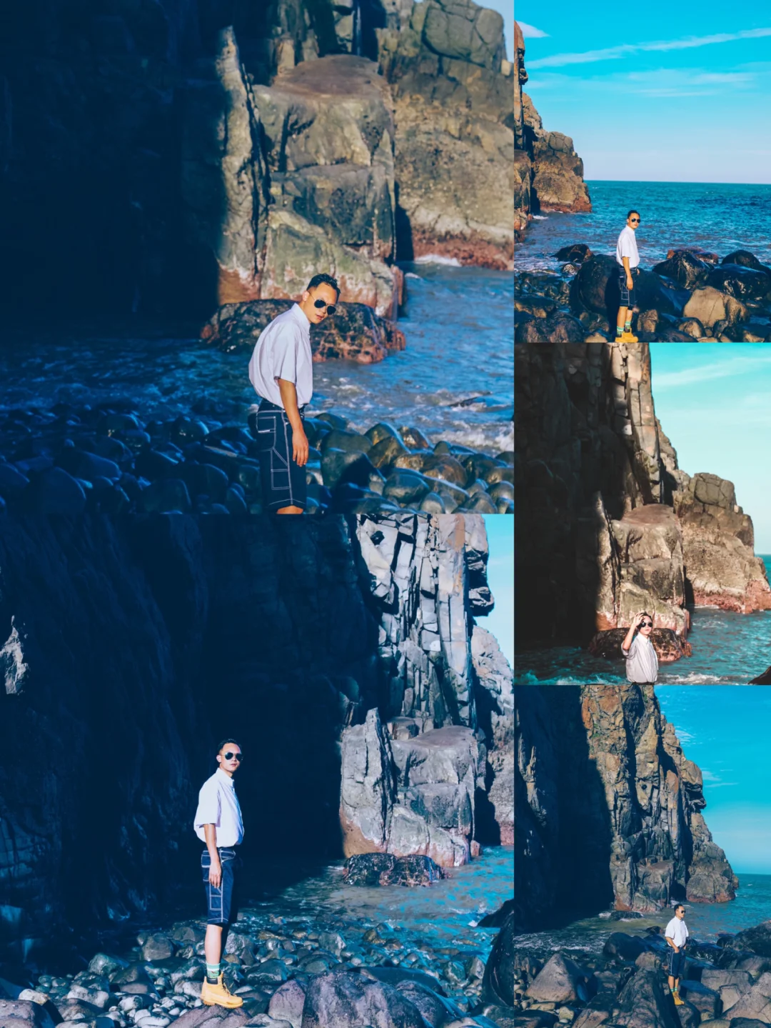 5⃣️利用傍晚的阳光,在黑色礁石上可以拍出不错的人物照片。
