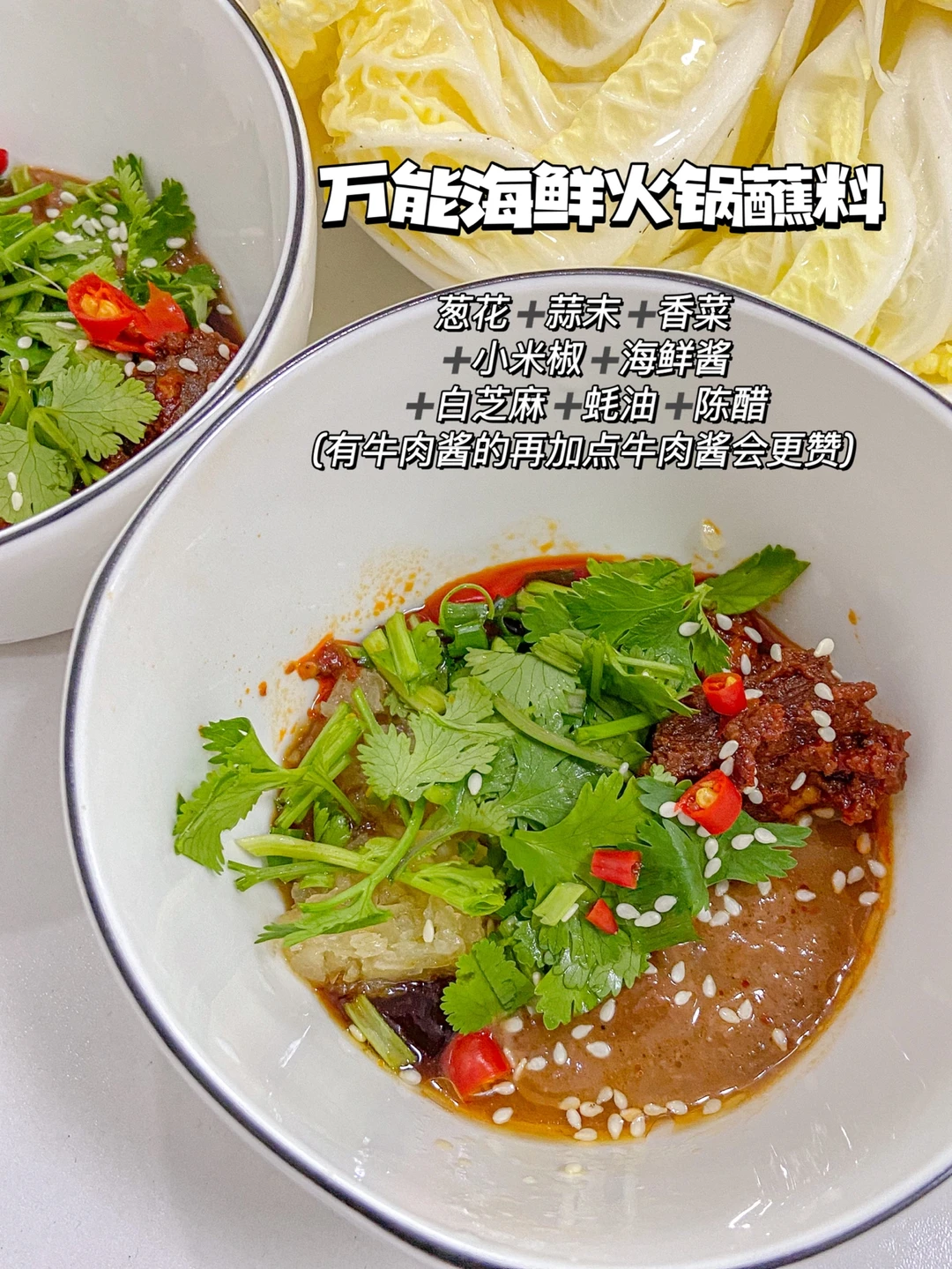 葱花➕蒜末➕香菜➕小米椒➕海鲜酱➕白芝麻➕香油➕蚝油➕陈醋(家里有牛肉酱的也可以加一点)